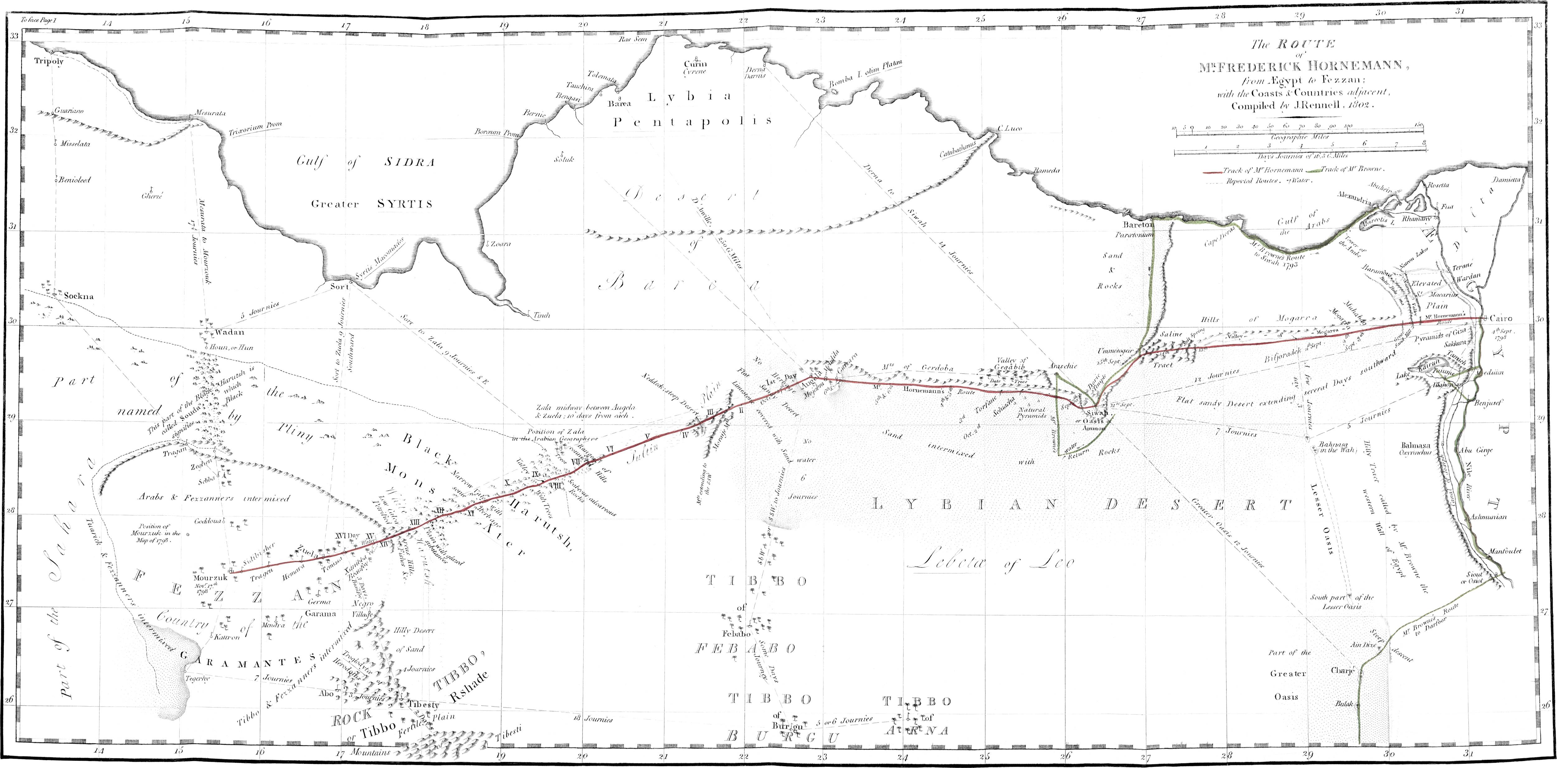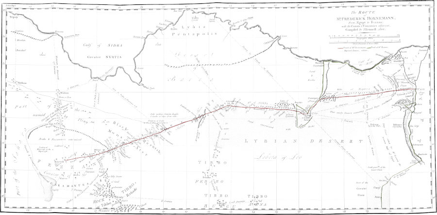 Under such patronage and protection from the General Bonaparte, and with his special passport and safeguard, Frederick Horneman safely reached the caravan passing from Mecca, and pursued, and accomplished his journey from Cairo to the kingdom of Fezzan; which from the general resort of caravans to its capital, Mourzouk, may be considered as the proper post of direction and outfit, for his further travels to the remotest regions of Africa.