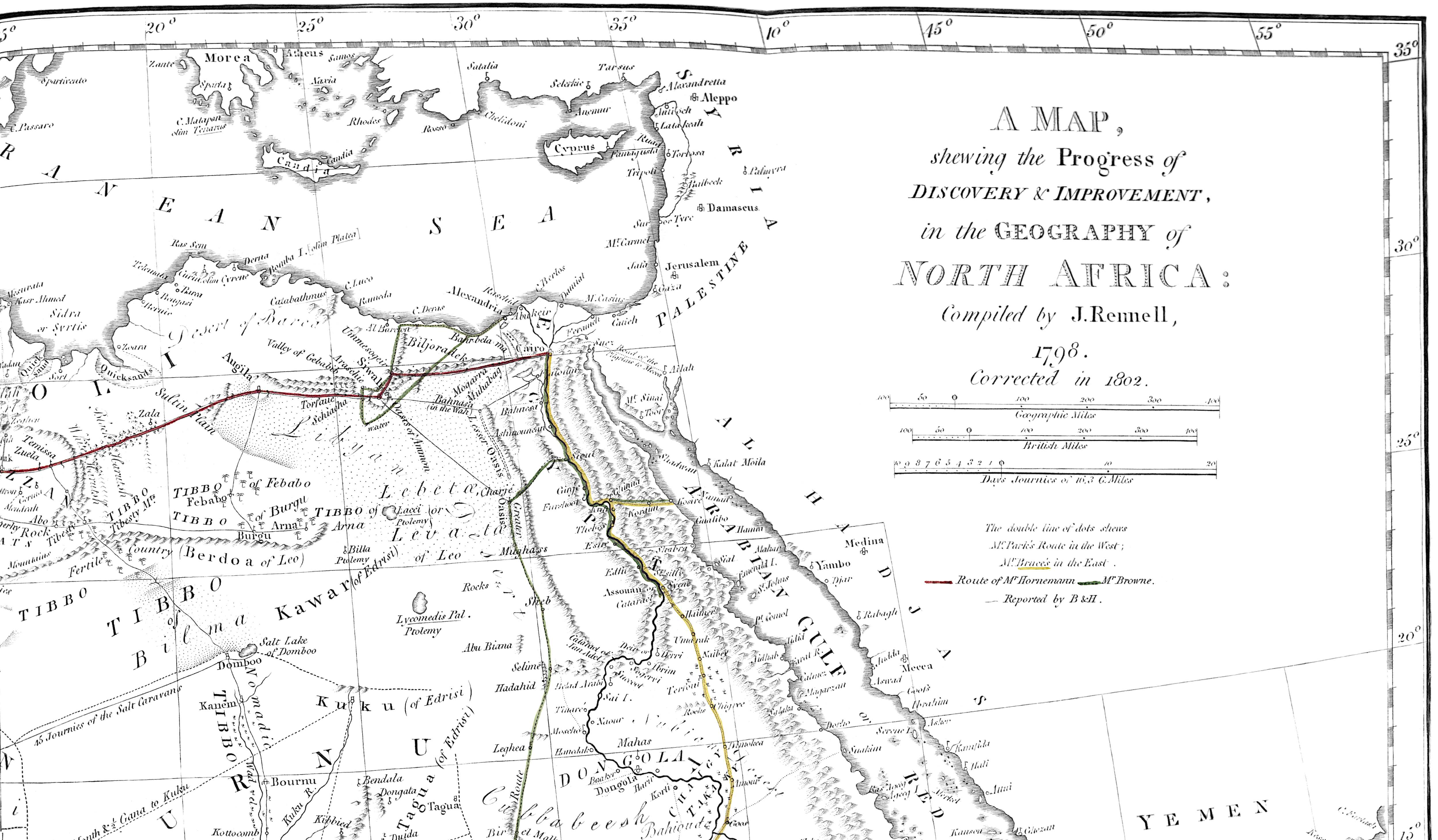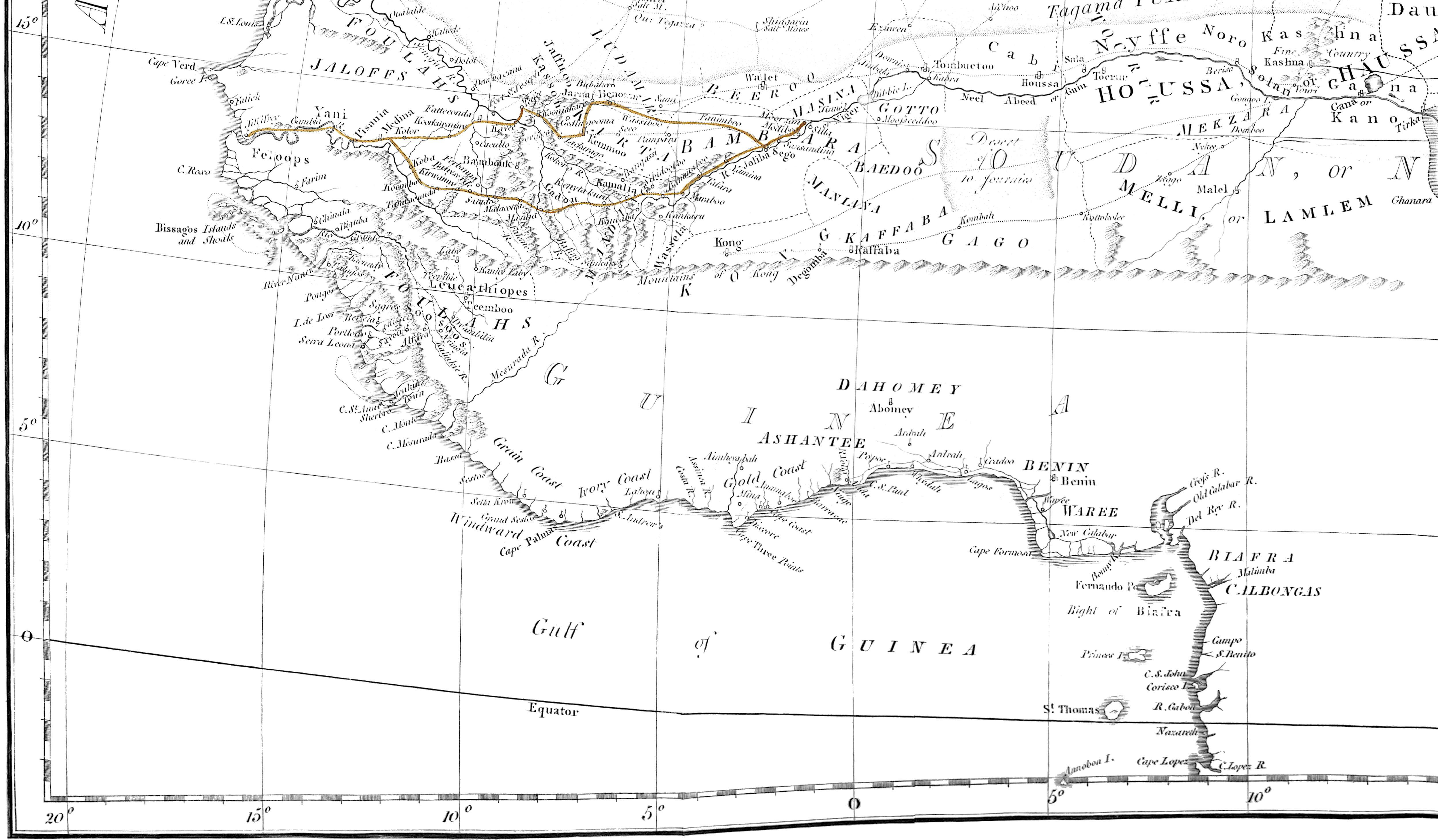 In planning the routes of Park and of Horneman, the Society availed itself of former communications, sagaciously discriminated the proper path of research, and have to exult in the success of each adventure. These emissaries have explored roads which shortly mercantile adventure will, and must enter. In this new race of commerce, shame indeed would it be to our national councils, could it possibly be supposed that from the default of patronage and support of Government, our commercial people may lose the start for a priority of factories and establishments of trade, and permit other nations to usurp the vantage ground[viii] which British enterprise, under the auspices of a patriotic and enlightened, but private institution, shall have explored, marked out, and prepared for them.