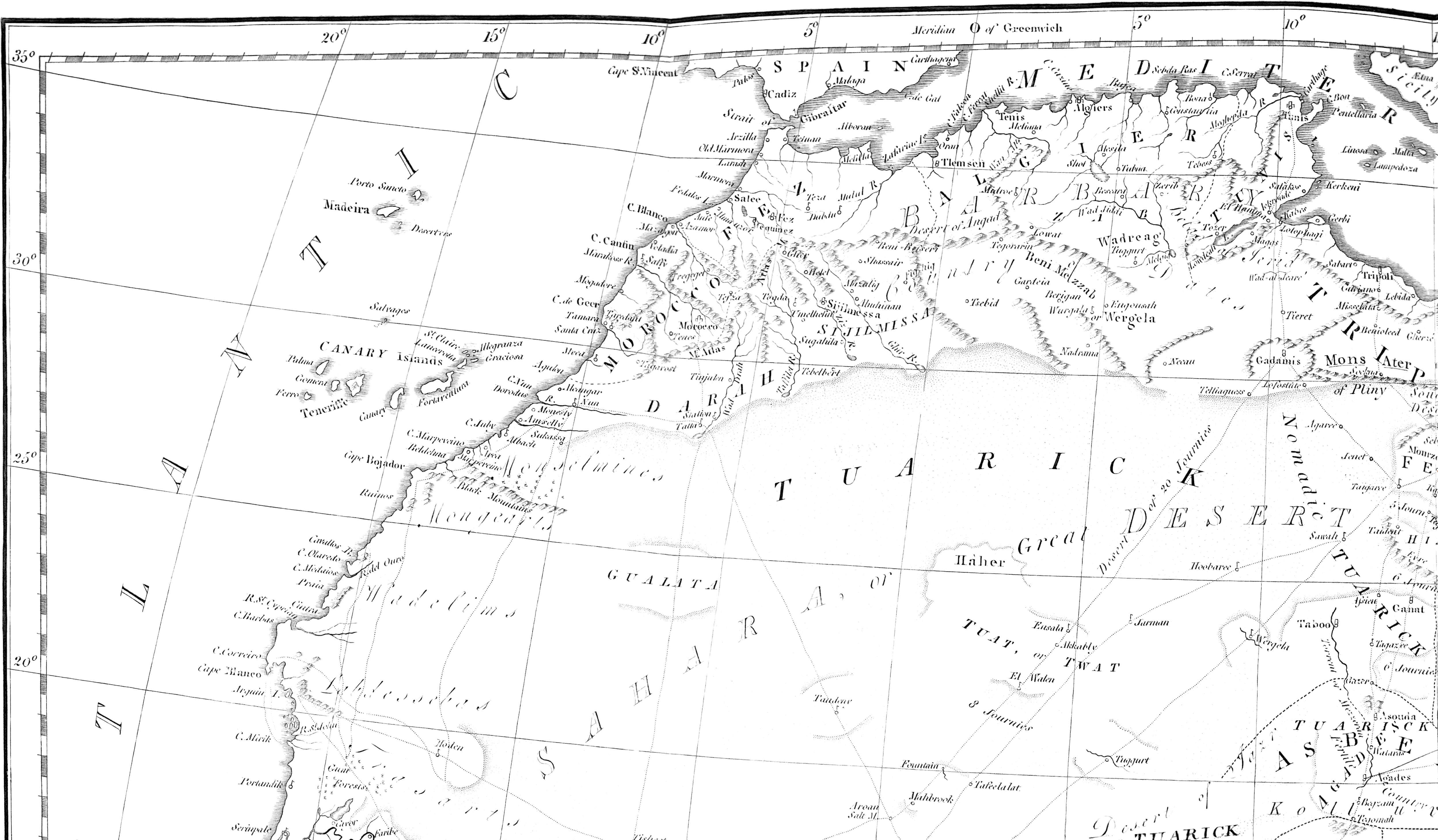 Be it allowed, that the narrators spoke of what they had heard, as well as of what they had seen; let it be granted that they were mostly ignorant, credulous, or partially informed; and that, distinctively and in detail, the accuracy of their representations was little to be depended on; yet on points wherein their accounts agreed, they merited attention and regard; they together opened a general view of the society, and of the country; and afforded matter of such reasonable conjecture and inference, as might warrant and direct the course of further investigation. Reflecting on these and other relations made by unenlightened men, it appears, that as the great continent of Africa, amidst its seas of sand, occasionally shews its Oasis, or fertile[iii] isle, rising in each desert; so, in analogy to the face of the country, does the blank and torpid mind of its people, display occasionally notes of intelligence and philanthropy; rich spots of genius, and partial scenes of improved social establishment. Having passed whole regions sterilized by apathy and ignorance, the result of superstitions, prejudice, and oppression, the enlightened traveller comes to a sudden view of some rich field of character, and contemplates with delight the free-born spirit and sagacity of the Tuarick of Hagara, and the ingenuity and benevolence of the Houssan. To unfold and disseminate these germs of civilization, is surely a noble task! What description of men and country can be more interesting? whither could the refinement of arts? whither could enlightened philosophy better tend, to humanize and improve? whither could the spirit of trade better direct its course? As we speculate on the projected intercourse, the noblest views open to the mind, anticipating reciprocal advantages: in the dispensation of intelligence and the arts of peace, carrying therewith complacent manners to rude and ferocious nations; and in a full compensation to the enlightened adventurers, from new materials of ingenuity and of commerce, and from new subjects of scientific inference, extending the advancement of human knowledge in all its branches.