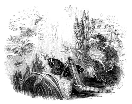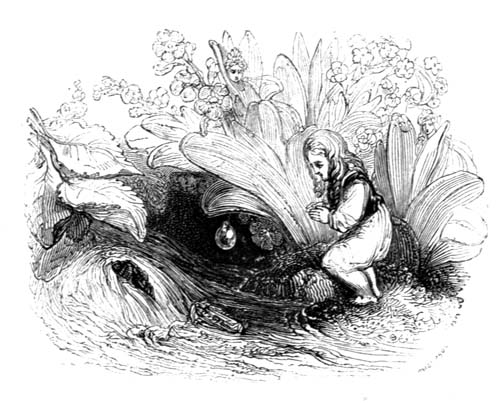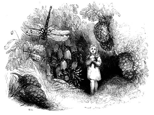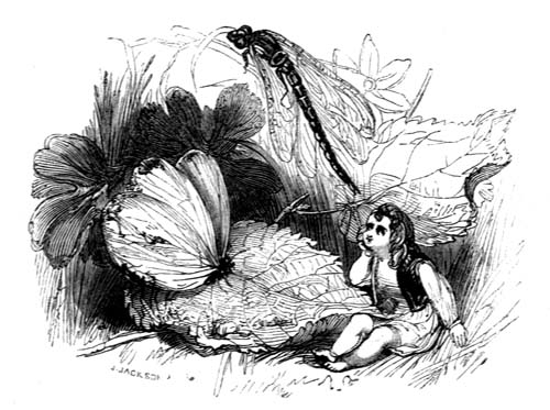 THERE was once a Child who lived in a little hut, and in the hut there was nothing but a little bed and a looking-glass which hung in a dark corner. Now the Child cared nothing at all about the looking-glass; but as soon as the first sunbeam glided softly through[10] the casement and kissed his sweet eyelids, and the finch and the linnet waked him merrily with their morning songs, he arose, and went out into the green meadow. And he begged flour of the primrose, and sugar of the violet, and butter of the butter-cup; he shook dew-drops from the cowslip into the cup of a harebell; spread out a large lime leaf, set his little breakfast upon it, and feasted daintily. Sometimes he invited a humming bee, oftener a gay butterfly, to partake his feast; but his favourite guest was the blue dragonfly. The bee murmured a great deal, in a[11] solemn tone, about his riches: but the Child thought that if he were a bee heaps of treasure would not make him gay and happy; and that it must be much more delightful and glorious to float about in the free and fresh breezes of spring, and to hum joyously in the web of the sunbeams, than, with heavy feet and heavy heart, to stow the silver wax and the golden honey into cells.