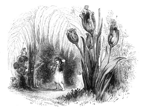 The Child thanked her for her true-heartedness, and passed on to the hyacinth who stood near the puffy, full-cheeked,[36] gaudy tulips. Even from a distance the hyacinth sent forth kisses to him, for she knew not how to express her love. Although she was not remarkable for her beauty, yet the Child felt himself wondrously attracted by her, for he thought no flower loved him so well. But the hyacinth poured out her full heart and wept bitterly, because she stood so lonely; the tulips indeed were her countrymen, but they were so cold and unfeeling that she was ashamed of them. The Child encouraged her, and told her he did not think things were so bad as she fancied. The[37] tulips spoke their love in bright looks, while she uttered her’s in fragrant words; that these, indeed, were lovelier and more intelligible, but that the others were not to be despised.