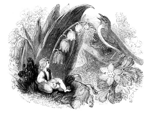 There was no end to his delight. The little birds warbled and sang, and fluttered and hopped about, and the delicate wood-flowers gave out their beauty and their odours; and every sweet sound took a sweet odour by the hand, and thus walked through the open door of the Child’s heart, and[45] held a joyous nuptial dance therein. But the nightingale and the lily of the valley led the dance; for the nightingale sang of nought but love, and the lily breathed of nought but innocence, and he was the bridegroom and she was the bride. And the nightingale was never weary of repeating the same thing a hundred times over, for the spring of love which gushed from his heart was ever new; and the lily bowed her head bashfully, that no one might see her glowing heart. And yet the one lived so solely and entirely in the other, that no one could see whether the notes of[46] the nightingale were floating lilies, or the lilies visible notes, falling like dew-drops from the nightingale’s throat.
