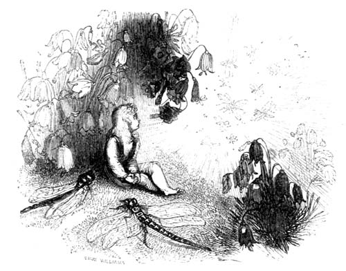 And now, as they looked at the Child, and every one of them saw itself reflected in his clear eyes, they rejoiced exceedingly, and called all their fellows together, and alighted on the bushes all around; and soon it was so light in the cave, that herb and grass began to grow[73] as if it had been broad day. Now, indeed, was the joy and triumph of the dragonfly complete. The Child was delighted with the merry and silvery tones of the bells, and with the many little bright-eyed companions around him, and with the deep red strawberries which bowed down their head to his touch.