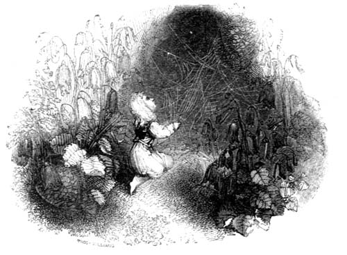 But the birds were fast asleep in their high nests, and the ears of the other animals were not delicate enough, or were too much overgrown with hair, to hear them. The fireflies alone heard the joyous peal, for they were akin to the flowers, through their common ancestor, light. They inquired of their nearest relation, the lily of the valley, and from her they heard that a large flower had just passed along the foot-path[72] more blooming than the loveliest rose, and with two stars more brilliant than those of the brightest firefly, and that it must needs be their king. Then all the fireflies flew up and down the foot path, and sought every where, till at length they came, as the dragonfly had hoped they would, to the cave.