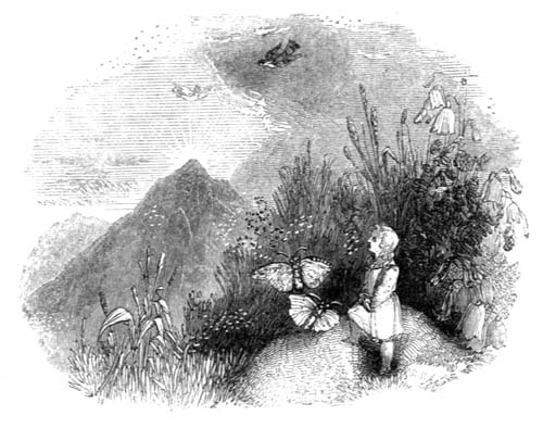 To this the butterfly assented; and he told, how, once on a time, he too had been greedy and sordid; how he had thought of nothing but eating, and had never once turned his eyes upwards to[12] the blue heavens. At length, however, a complete change had come over him; and instead of crawling spiritless about the dirty earth, half dreaming, he all at once awaked as out of a deep sleep. And now he would rise into the air;—and it was his greatest joy sometimes to play with the light, and to reflect the heavens in the bright eyes of his wings; sometimes to listen to the soft language of the flowers and catch their secrets. Such talk delighted the Child, and his breakfast was the sweeter to him, and the sunshine on leaf and flower seemed to him more bright and cheering.