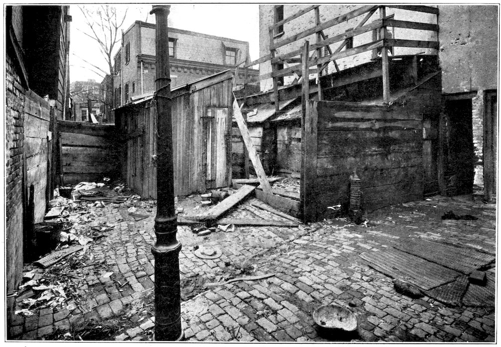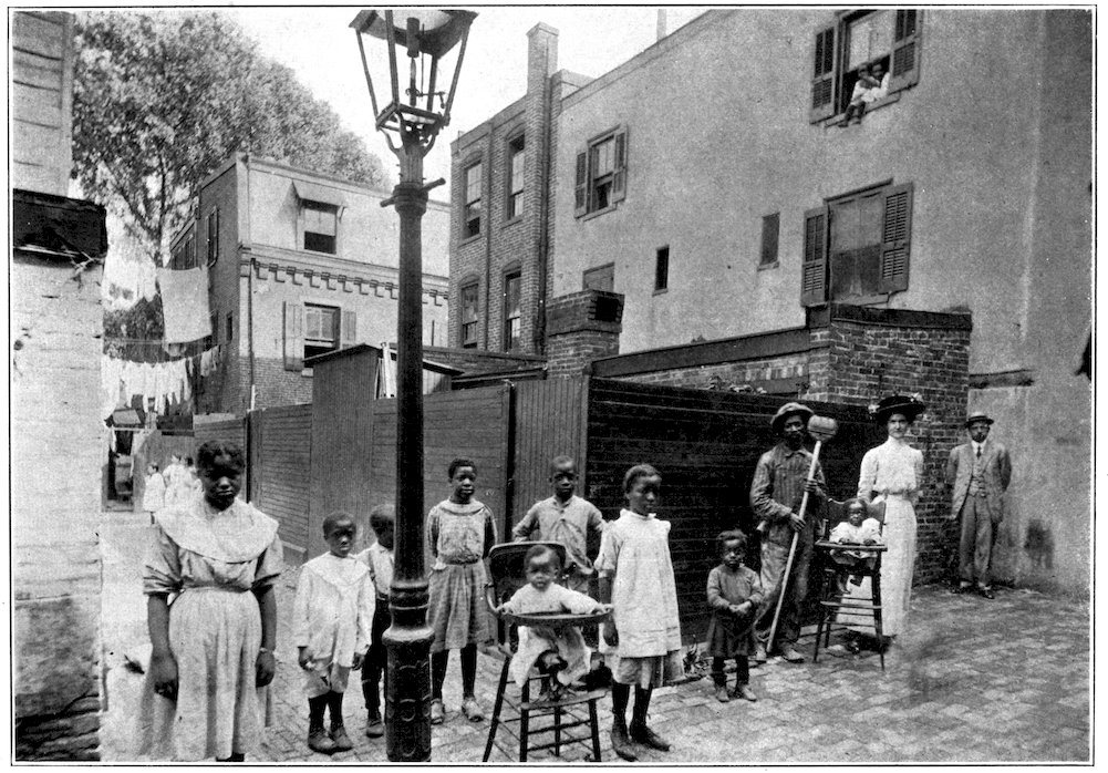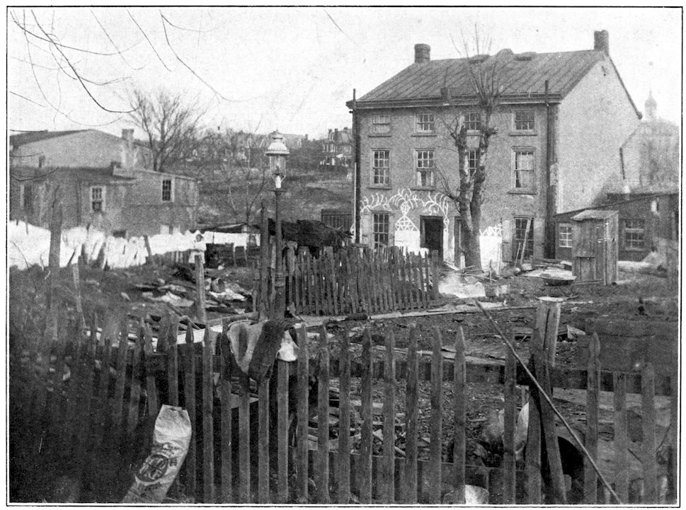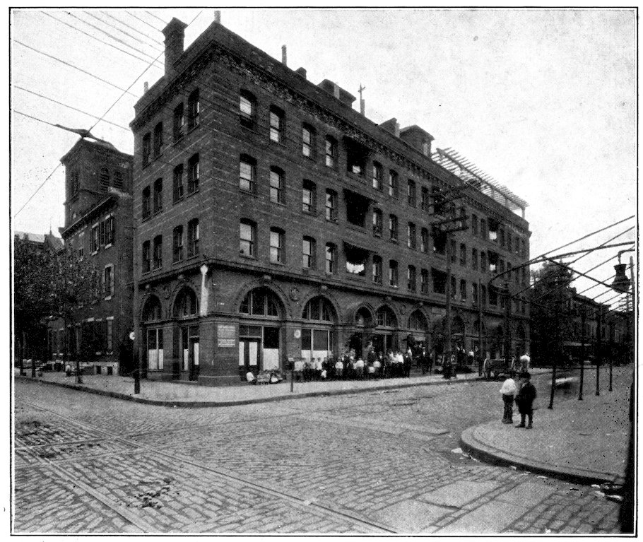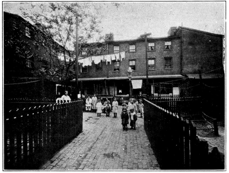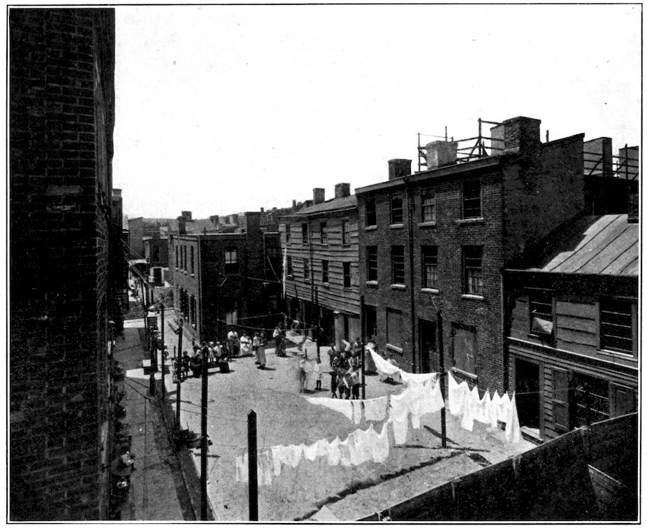 There are tenements, of recent origin: there is in prospect a tenement problem. But the satisfaction of the developed instinct of the home-builders and housekeepers of Philadelphia does not lie in the direction of the sky-scraping multiple dwelling, which replaces a front porch with a fire-escape, makes a box of geraniums or a rubber-plant do duty for a garden, festoons the vista between towering walls with “the short and simple flannels of the poor,” and suspends the growing child like Mahomet’s coffin half-way between a clouded heaven of grimy skylight or gravelled roof and the cluttered inferno of the pavement far below.