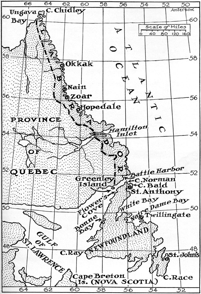 He planned, therefore, to go by dog-team northward to the Straits of Belle Isle, and then alongshore rounding Cape Bauld and Cape Norman, and on down the west coast to the railroad at Curling which would take him to Port aux Basques. At the latter place, the southwestern corner of Newfoundland, an ice-breaking steamer would carry him over Cabot Straits to North Sydney, and there he could get a [299]train which would make connections for New York.