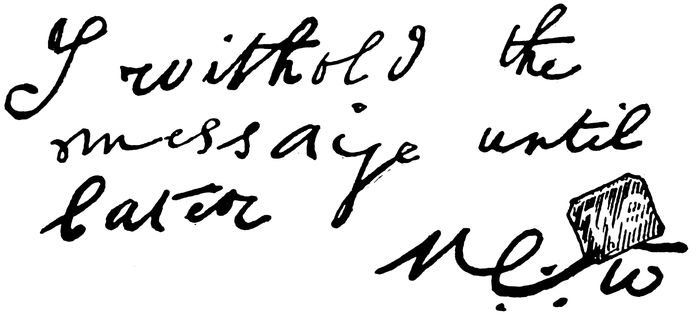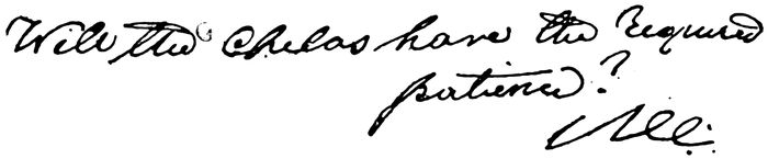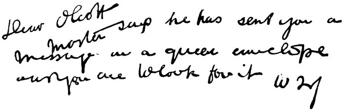 The story of the Cabinet missive is briefly this (see “Isis Very Much Unveiled,” p. 28). Mr. Judge suggests to Mrs. Besant that they should put a question to the Masters by writing it on paper, and placing this in a certain cabinet in “H.P.B.’s” room. The result was the endorsement of the paper with the words, “Yes,” “And hope,” in the red script used in all these communications, and also the impression of what Madame Blavatsky called the “flap-doodle” seal, under circumstances which demonstrated either psychic precipitation on the part of the Master, or else vulgar trickery on the part of Mr. Judge.