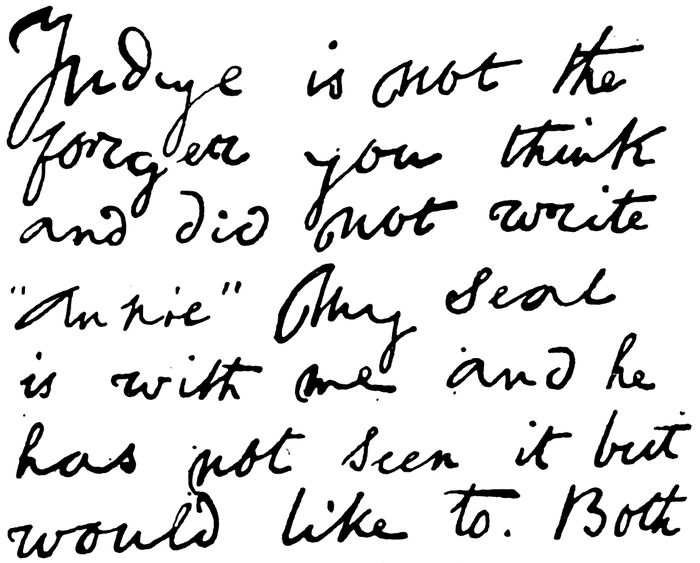 139But that was not always Mr. Judge’s line. After all, somebody must have been at pains to see to the seal impression in those missives which Mr. Judge vouched for—to say nothing of such other external and material things as the texture of the paper, quite unlike any found elsewhere, and the handwriting and signature, all of which used to be triumphantly cited as evidence by Mr. Judge’s satellites (the present quotation is from a pamphlet on “Mahatmas,” embellished with learned references to “Lord Bacon,” which is by Mr. Judge’s private secretary, and bears the imprimatur of Mr. Judge). Mr. Judge denies that it was he who called special attention to the seal impression as authenticating his first pioneer missive in 1891 (the “Note the Seal” missive, as I have called it). As he does not deny my statement that he excused himself to the others present for not showing the contents of the letter, perhaps he will explain what it was that he did call attention to, if not the seal and signature. But why labour the point, when there is the direct evidence afforded by one of his own seal-bearing letters—one which he has not denied—in which he wrote, “I believe the Master agrees with me, in which case I will ask him to put his seal here”—and “plump on the written word came the seal” (“Isis,” p. 34). In those days at any rate Mr. Judge was of those who “think these little decorations of importance,” as he now puts it.