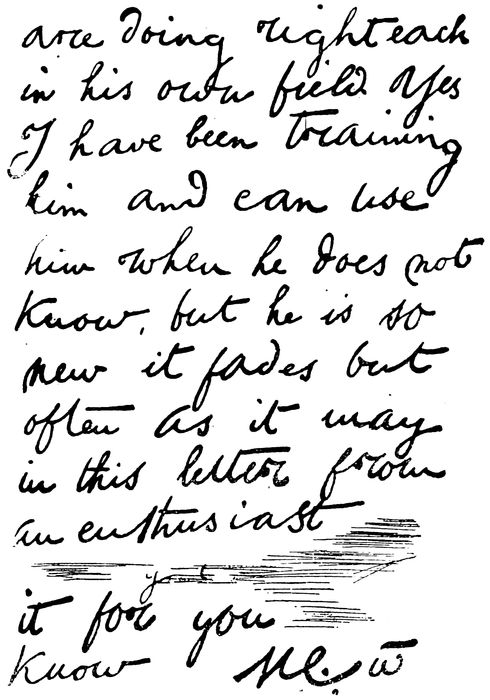 Then there are the contents. These also fit admirably into the chain. The Master is made to declare that “Judge is not the forger”—a point of which Mr. Judge was trying hard to convince the Colonel; also, to provide explanations of various suspicious circumstances in other missives which tended to show that Judge was “the forger”; 138also to exculpate Judge for various misstatements by suggesting that he was an unconscious vehicle.
