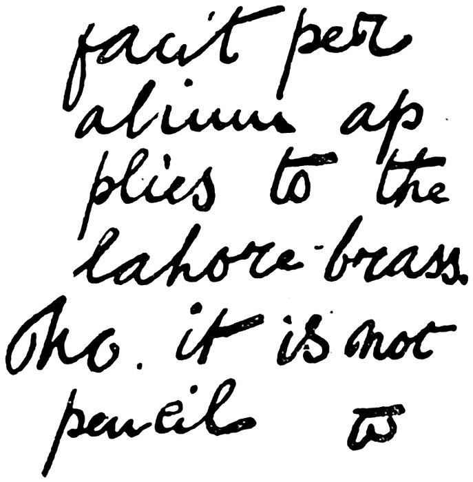Then, there is the description of the “flap-doodle” seal as “the Lahore brass”—a bad shot at the place of origin known to Olcott, but only half known to Judge. Attribute this to Mr. Judge trying to startle his colleague, and it exhibits just that mixture of fatuity and cunning which appears throughout the vice-president’s transactions. Attribute it to Colonel Olcott manufacturing a pretended Judge forgery, and it becomes a refinement of malignant ingenuity such as his worst enemy, I fancy, will not suspect Colonel Olcott of compassing, either himself or through an agent.