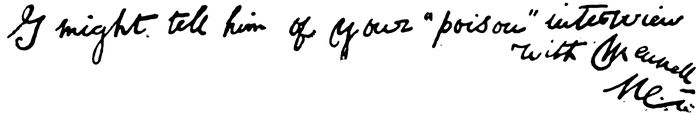 Now, on the facts stated, it is obvious that only one person can authoritatively contradict Mr. Judge here: to wit, Mrs. Besant. This I am bound to suppose that she will do; for my version of the story is that given by her on the day after the occurrence to a colleague, who quoted it from his diary. Mrs. Besant also showed what purported to be the missive, sealed and endorsed as described, and this to several people. At Adyar, at the beginning of this year, when the Judge missives were being blown upon all round, she repeated the story, with only one correction—a notable one—that she had not, as she at first implied, stayed in the room all the time during Mr. Judge’s working of the Cabinet oracle.