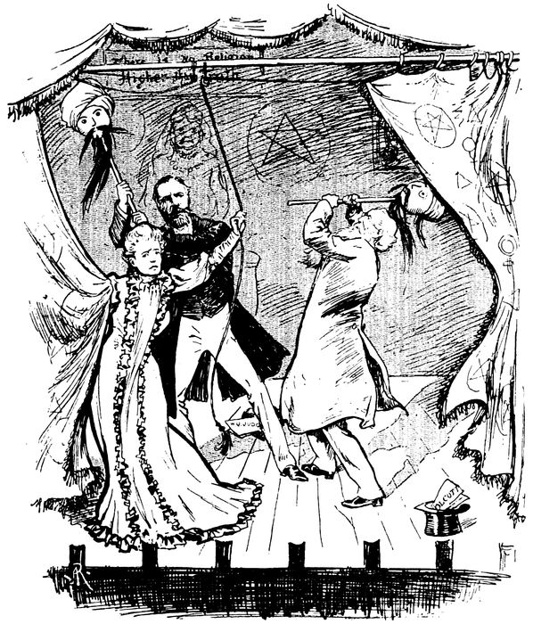 In 1878 the society moved its headquarters to India, and in the congenial atmosphere of the mysterious East launched into marvels. Eked out by performances not unlike a drawing-room Maskelyne and 14Cook, Madame’s rehash of Neo-platonist and Kabbalistic mysticism with Buddhist terminology soon “caught on” with the impressionable natives. It had especial attraction for the educated and ardent young Babu, that typical product of British India whom Mr. Rudyard Kipling has so often drawn for us. But it also carried away, thanks to Madame’s intense personality—half repulsion, half charm—editors and officials of mark in the sceptical circles of Anglo-India. It made Mr. A. P. Sinnett (then editor of the Pioneer) turn evangelist in “The Occult World,” and Mr. A. O. Hume (then Government Secretary) follow suit with “Hints on Esoteric Philosophy.” And no wonder. Never was a new religion more industriously supplied with miracles—those coups de main célestes, as a witty Frenchman has defined them. Wherever Madame happened to be with a select circle of friends, disciples, or laymen worth impressing, but especially in and about the bungalow at Adyar, near Madras, the society’s headquarters, the invisible Mahatmas were never tired of exhibiting their astonishing psychic powers over ponderable matter. The two who were especially at Madame’s disposal went by the names (reverently breathed) of Mahatma Morya and Mahatma Koot Hoomi Lal Sing. In the region of White Magic they could do almost anything—any feat which an adroitly led-up conversation might happen to suggest. But the particular lines of business (if I may be allowed the phrase) of which they made a speciality were making objects appear and disappear: in Madame’s jargon, integrating and disintegrating them by a psychical command over astral vortices of atoms. Sitting in their studies 2,000 miles away in Tibet, they could, by a mere effort of will, project an astral epistle, or an astral body, or an astral cup and saucer, into the middle of an applauding circle at afternoon tea or picnic in Madras or Bombay. Showers of roses fluttered down from the ceiling. Invisible bells tinkled from none knew where. All kinds of tricks were played with Madame’s interminable cigarettes. Sketches and treatises were psychically “precipitated” on to blank paper, nay, sometimes the very stationery was created out of nothing to receive them. Such inferior sketches, 15too, and such twaddling, such very twaddling, treatises! One disciple—Damodar K. Mavalankar, a youth passionately ambitious of fame—even advanced to the acquirement of some of these extraordinary powers in his own person. Merely to have seen the astral body of a Mahatma became in a manner a cheap accomplishment. Damodar boasted that he had once or twice projected his own—slipping spook-like through a brick wall.