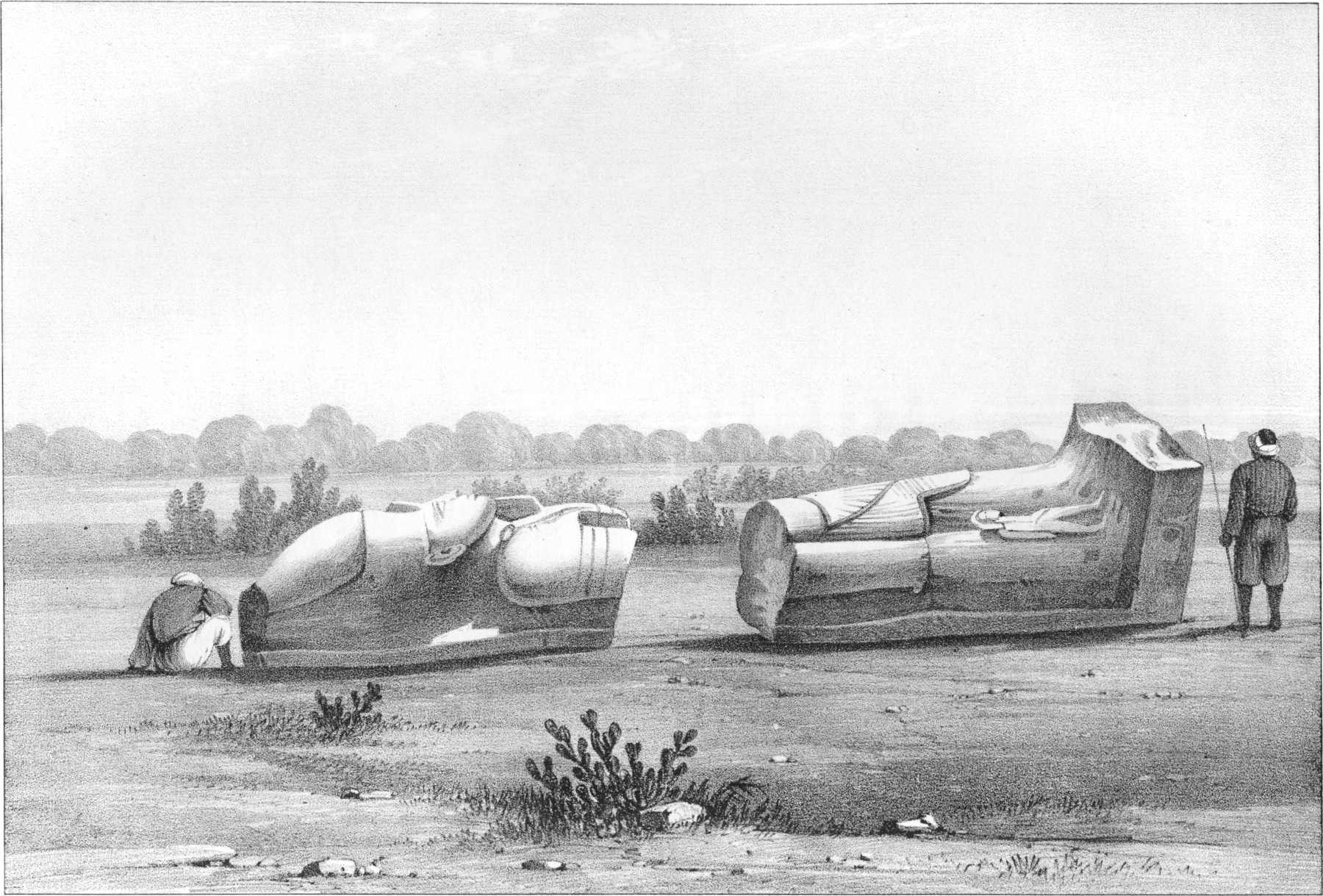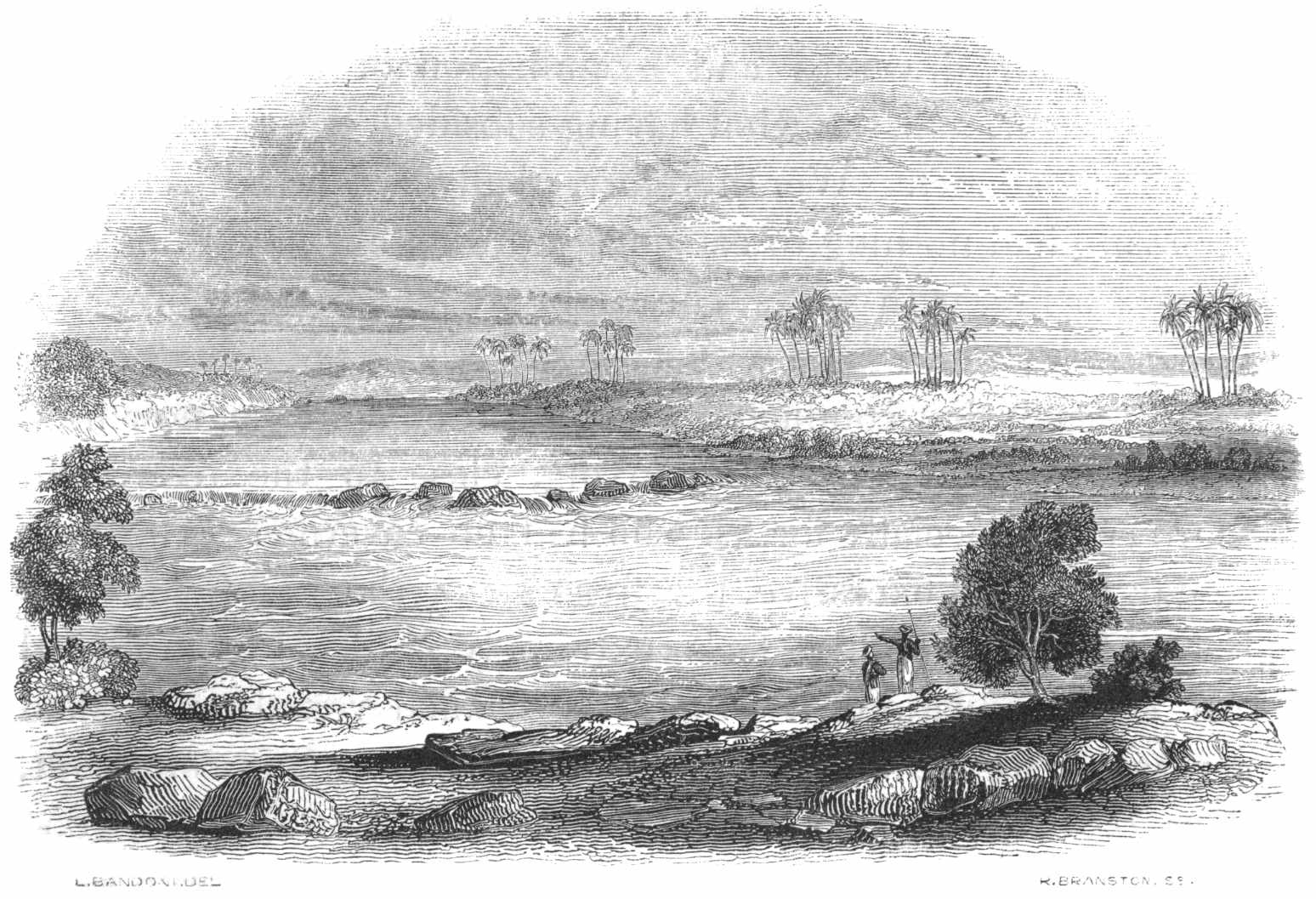 “April 8. 1832.—Our pilot afforded us a curious exhibition, although not, I believe, uncommon; but to us it was new. He pretended or believed that his saint, to whom he had been addressing his evening devotions, had entered his body, and he immediately fell into the most violent paroxysms, throwing his arms about, rolling his head, and twisting his body in a very outrageous manner: sometimes he held up his hands, and shook, as in the most dreadful convulsions, groaning most piteously, and gabbling forth all sorts of gibberish. The sailors made a circle round him, and continued making low obeisances, calling on Mahomet to assist him, for nearly two hours; they believe that, unless they did this, the saint would never leave him, and he would have probably died. The man, in his madness, seemed to have a great jealousy for his honour; one of the mariners was sleeping on board the boat, while the others were on the banks praying for them; on a sudden he darted into the boat, and, had he not been detained, would have roughly used the drowsy mariner. After all the Mahometans near him had joined the circle to pray for his recovery, he returned, by degrees, to his senses: when the fit was over, he lay for some time apparently quite exhausted. The man is remarkable at other times for the mildness of his manner, and is one of the finest looking Nubians I have seen, being above six feet high, with uncommonly handsome features. The people consider those who are thus possessed as peculiarly favoured, not one in a thousand being so fortunate. After death they are generally considered as saints, and have tombs erected to them by the government, which does this, no doubt, to gain popularity, or conciliate the people: but it is generally believed that the saint has appeared to the Pasha, ordering him to erect it.”