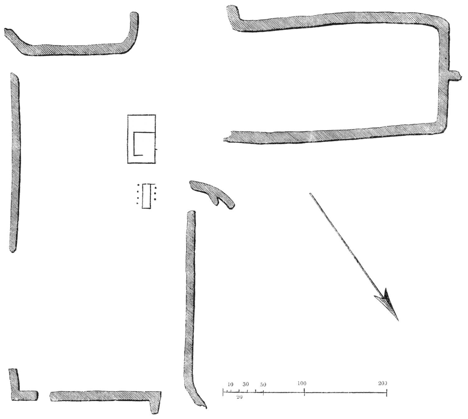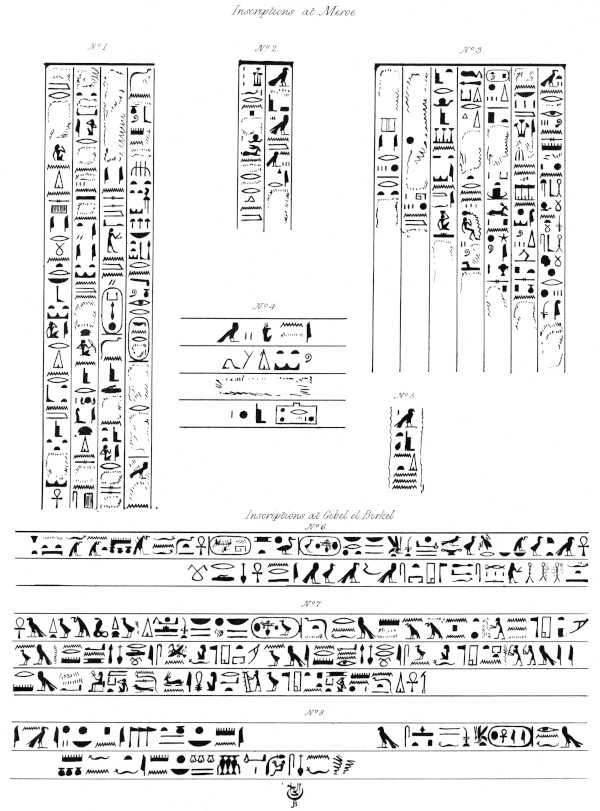 [50]Inscription No. 1. is from the same portico, and opposite to a large figure, similar to the one in Plate X., Sculpture, Meroe. No. 2. is before a figure presenting offerings. No. 4. before a figure of Anubis. No. 5. before a figure of Horus. The tablet, No. 3. is in the same portico, over a figure kneeling before a funeral boat, very much defaced, at the end of the portico. As will be seen by the plate, these inscriptions are very much injured; but, although the least perfect of any that I possess, I publish them, because they are the most important, being from the pyramids of Meroe. No. 6. is an inscription which was above the sculpture on one side of the first chamber excavated out of the rock of the Temple of Tirhaka, Gibel el Birkel. No 7. is another portion of this apparently dedicatory inscription, going round the whole of the room. The hieroglyphics are large, well executed, and very legible, except some which were quite defaced, and others almost covered with dirt. No. 8. are fragments from the large granite altar in the western corner of the great Temple, Gibel el Birkel. The first line is on the south-east side, the second on the north-east; the remainder of the hieroglyphics on this altar I have not been able to publish. Plate LIII. shows the two subjects on the altar in the sanctuary of the same temple. (See Plate XXIV.) I have alluded to them in my description of the ruins.