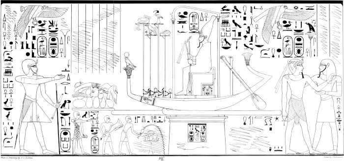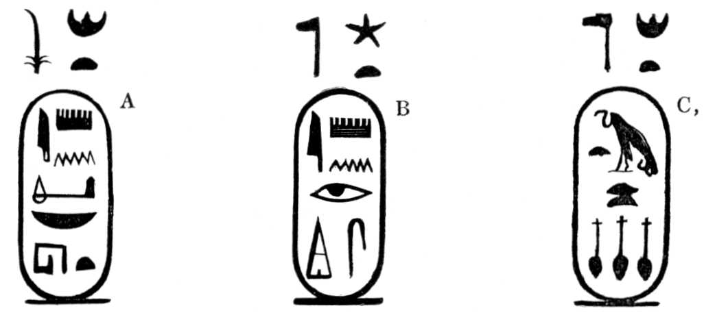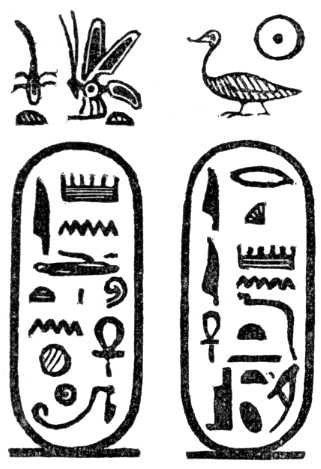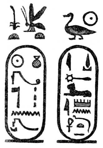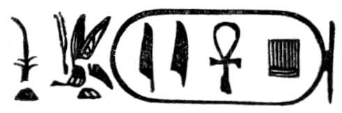 Meroe. (See Plate X.) There is a fragment of a figure of a god, with the hieroglyphics before it; this is evidently the god Sebek, which, with the Greek termination, makes the Sevechus of Eusebius; but, although the name in the list and that of Eusebius and Africanus are made thus to agree with the name in the Bible, I have some doubts if Signor Rosellini is correct in the connection he supposes between the name of these hieroglyphics and the god Sevek; for the Ethiopians apparently wrote the name of that deity in the same manner as the Egyptians, and yet not one of the hieroglyphics used in writing the name of the god is employed in that of the king.