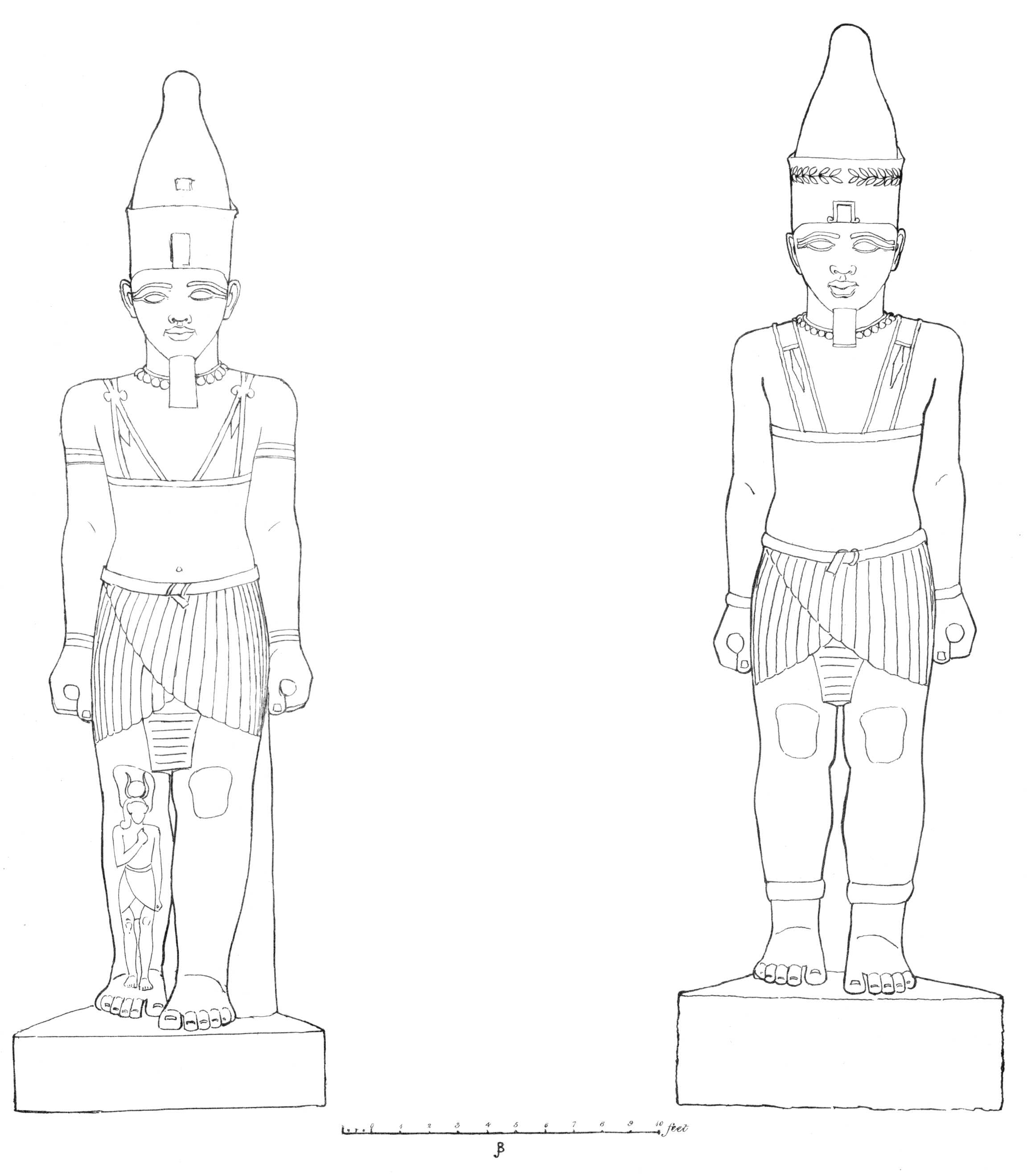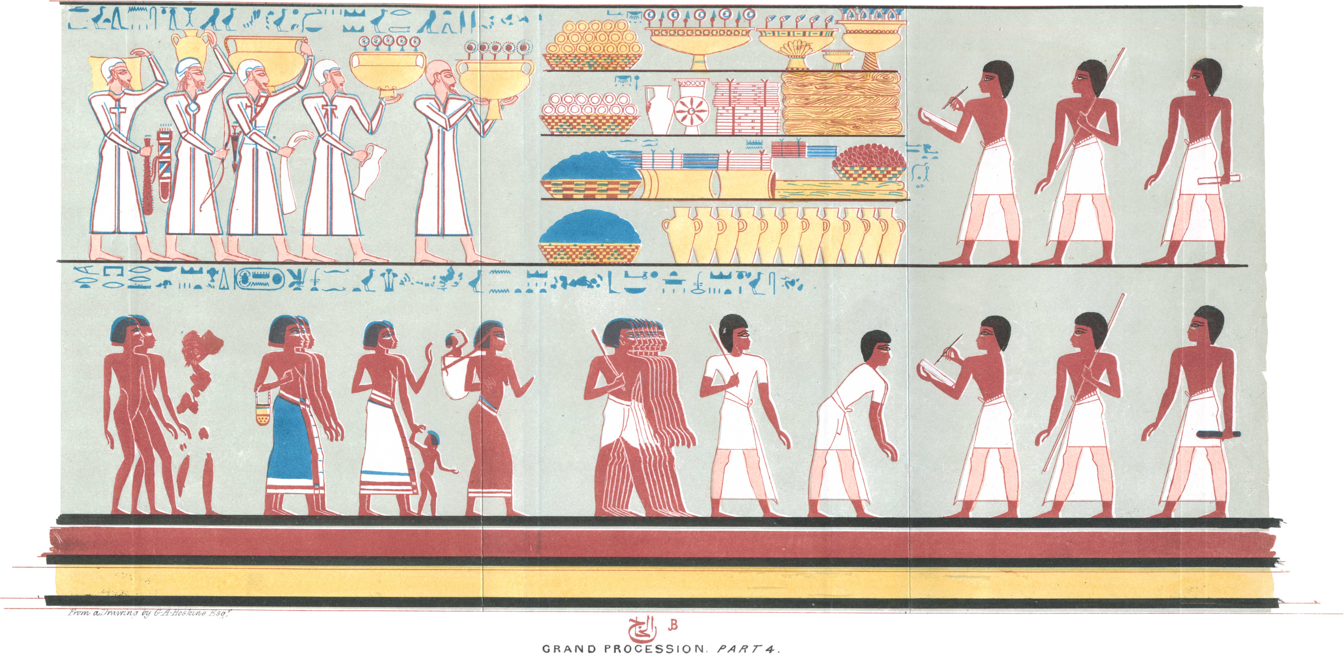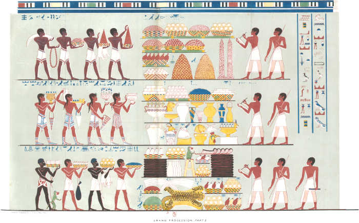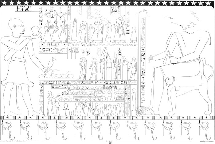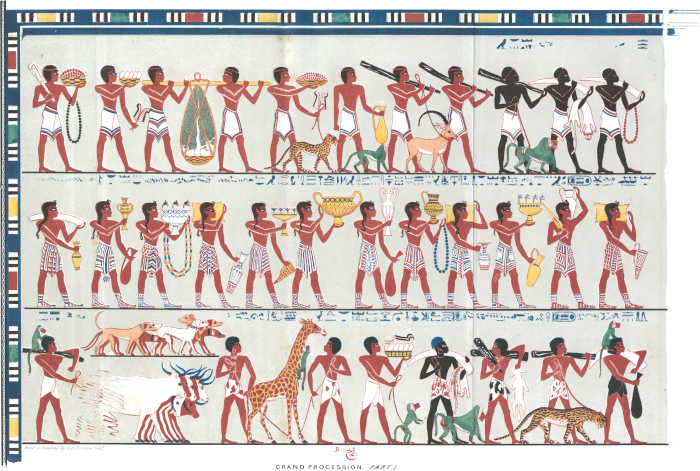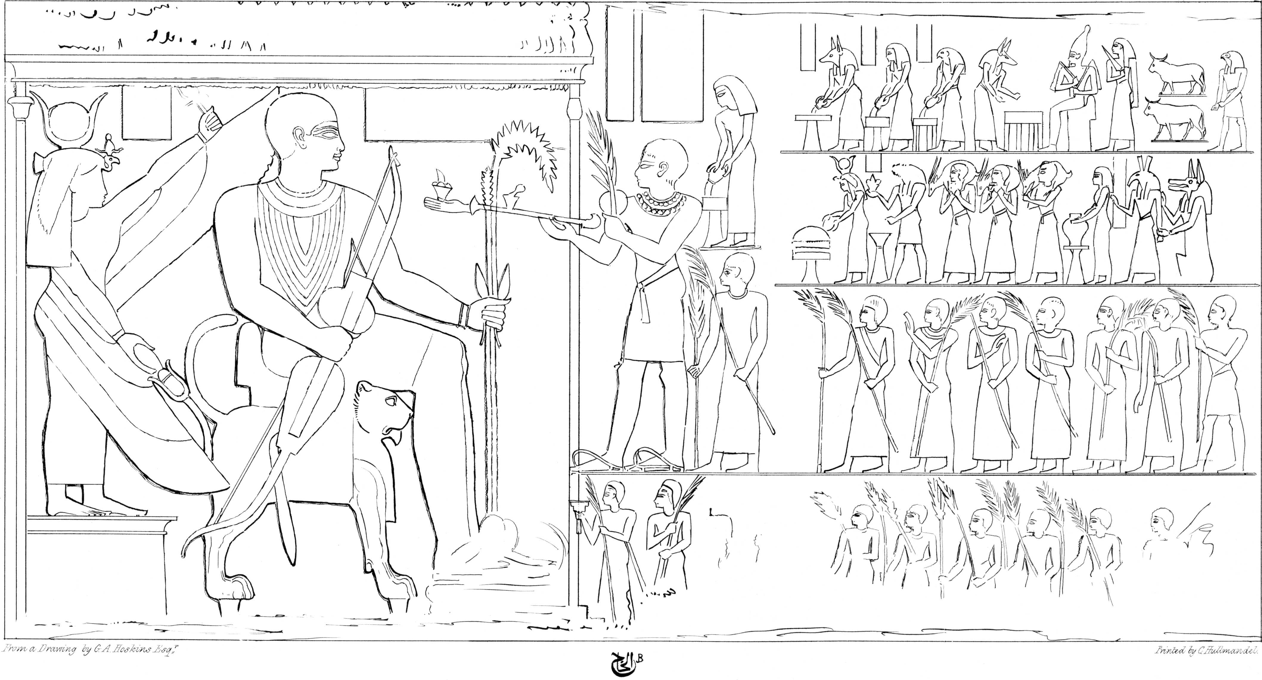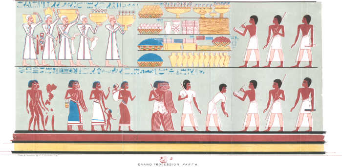 [85]I regret that in some few of the impressions the caps were printed black. The reader must be aware, that the management of such engravings as these is excessively difficult. Four colours are impressed from separate stones—red, blue, black, and the ground. The others were put in by hand. I took great pains in superintending the mixing of the colours, to give the reader as exact a representation of an Egyptian painting as was in my power. I am indebted to Mr. Bonomi for having drawn for me on the stones these and the other plates of sculpture.