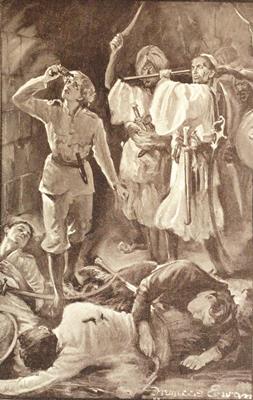 In a quarter of an hour all was ready, and at the head of over fifty mounted men Conrad rode off at a foot-pace, the unmounted men following close behind. When within a quarter of a mile of the castle, Conrad gave the order, and at a canter they rode towards the gate. As they approached, the men broke into a cheer, and the garrison, taking this as a proof that success had attended them, and that the fugitives had been captured, answered with[Pg 163] shouts of welcome. As Conrad had expected, the drawbridge was down and the gate open. As he rode in with his men Conrad raised a shout: "A Waldensturm! a Waldensturm! kill! kill!" and instantly attacked the men who were gathered inside the gate to welcome the baron's return. Taken wholly by surprise, their resistance was feeble, and the thirty or forty men in the courtyard were speedily despatched; but by this time those on the walls were pouring down to the assistance of their comrades. Conrad blew his horn; his followers dismounted and rushed for the new-comers, and just as they did so the unmounted men ran in through the gate with loud shouts. A panic seized the baron's retainers, and these again ran up the steps to the top of the wall. Many of the assailants would have followed them, but Conrad called them off. He knew that the stairs could not be carried without great loss, as a dozen men at the top of each of the flights of steps could hold them against hundreds. The fight had not been conducted in darkness, for there were many torches burning in the courtyard. "We will wait till morning," he said; "they are like rats in a trap." At this moment a sudden uproar was heard in the inner courtyard, and shouts of "Waldensturm! Waldensturm!" and a couple of minutes later Johann and his party rushed in through the[Pg 164] upper gate, where they stopped, astonished at the quietness that prevailed.