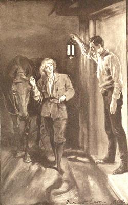 On leaving the stable she put the padlock into its place, but did not lock it; then she wrote a line to leave in her room, telling her parents what she had done. She had, during the day, taken out a suit of her brother's clothes, which fitted her fairly well. She had already saddled her horse, and put his bridle on. When she went up to bed she changed her clothes, knowing that it would be far easier to crawl in boy's clothes than in her own. Her window had been open all day, and she now fastened two blankets firmly together, tied one end to the leg of a table by the window, and after waiting until she knew that all the house, with the exception of the two men on guard, were fairly asleep, she slid down the blanket. It was but some ten feet to the ground. She was now within a few yards of the stable, which was built facing the house. She opened the door, noiselessly felt her[Pg 190] way to her horse, and led it to the door. Then she laid the reins across his neck, stroked his nose—a signal which he well understood was an order for him to stand still until she whistled for him,—and then she lay down and crawled noiselessly along. She had left her shoes behind her lest they should scrape against the wall while she descended.