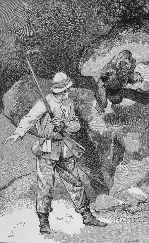"The noise which had aroused us was made by a rolling stone striking a rock; and looking up I saw some fifty yards away, not in the wood, but on the rocky hillside on our side of the ravine, a bear standing, as though unconscious of our presence, snuffing the air. As was natural, I seized my rifle, cocked it, and took aim, unheeding a cry of 'No, no, sahib,' from Rahman. However, I was not going to miss such a chance as this, and I let fly. The beast had been standing sideways to me, and as I saw him fall I felt sure I had hit him in the heart. I gave a shout of triumph, and was about to climb up, when, from behind the rock on which the bear had stood, appeared another growling fiercely; on seeing me, it at once prepared to come down. Stupidly, being taken by surprise, and being new at it, I fired at once at its head. The bear gave a spring, and then—it seemed instantaneous—down it came at me. Whether it rolled down, or slipped down, or ran down, I don't know, but it came almost as if it had jumped straight at me.