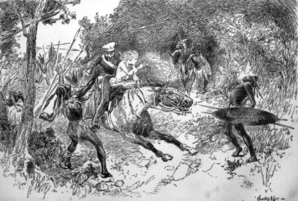 "'Hold tight, Mary,' he said, as he cut down a native who was springing upon him from the bushes."