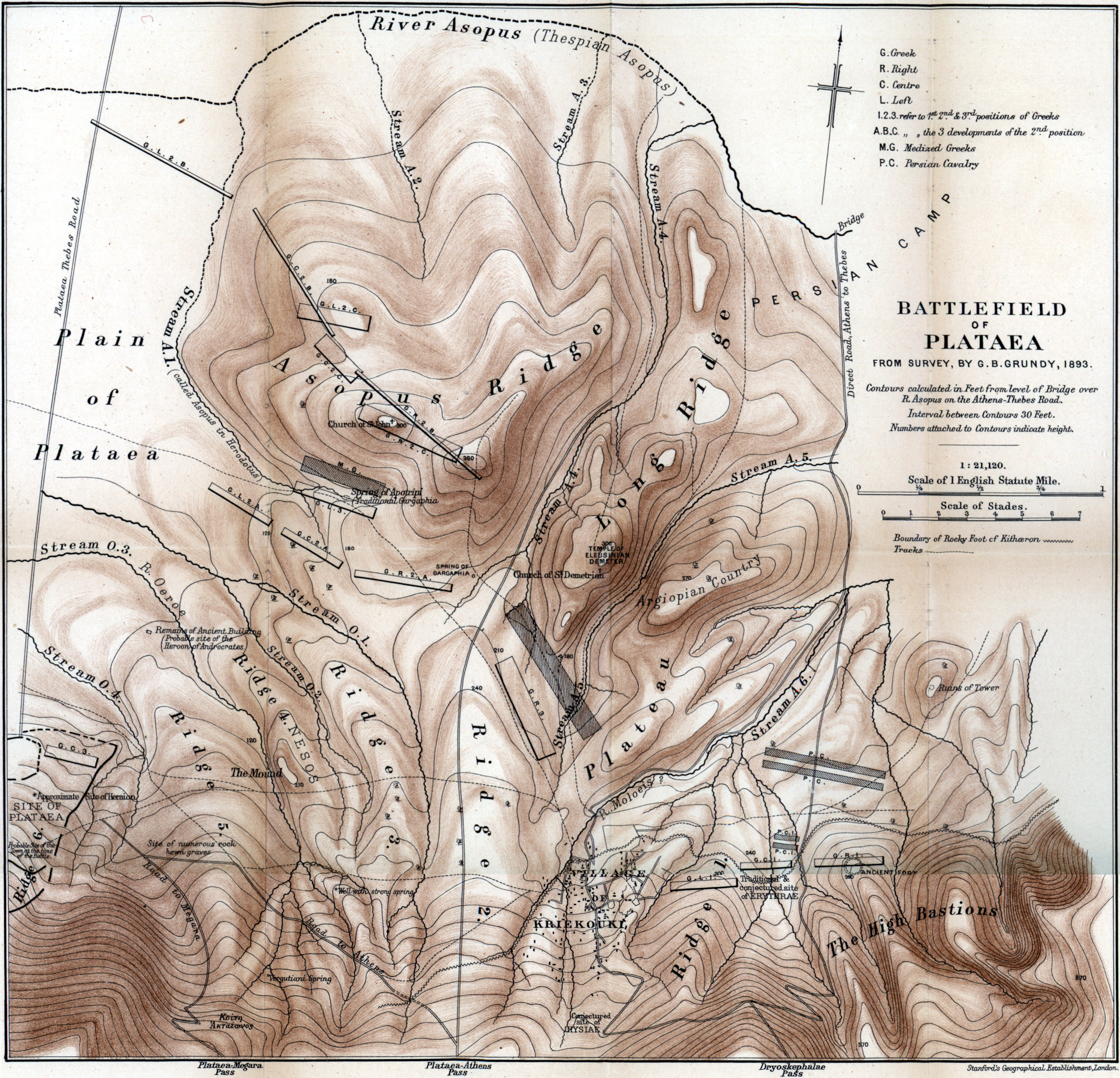 1. The Greek right was near the spring of Gargaphia, not on the Asopos ridge, while the left was near the Heroön of Androkrates.