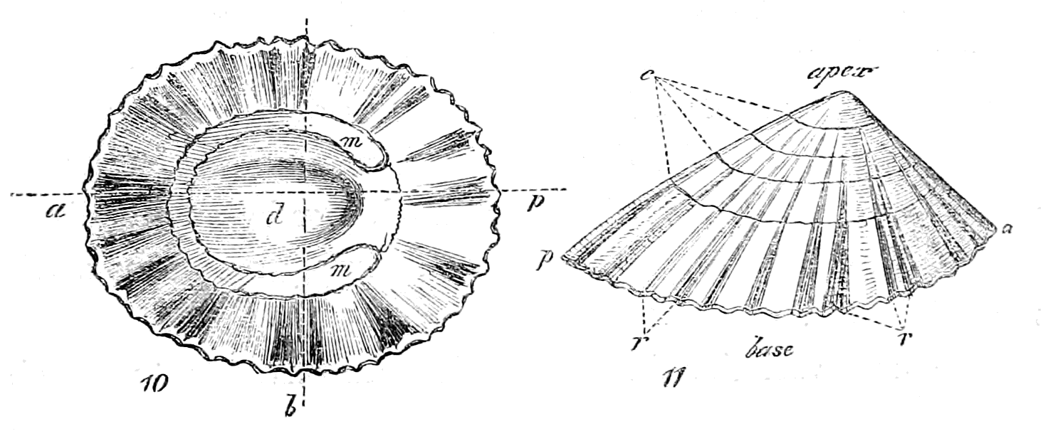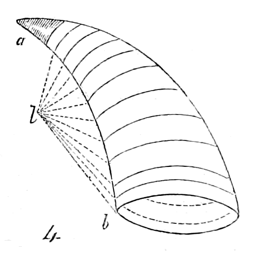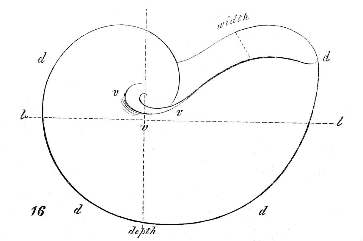 The nucleus, or first formed portion, may for technical purposes be considered, mathematically, as the apex of a spiral cone. And here it must be observed, that whether the shell consist of one or several pieces, each piece has a separate nucleus, and the process of formation is separately repeated with each. The word cone is used for convenience, and its meaning extended so as to include all those structures which commencing at a point enlarge downwards.