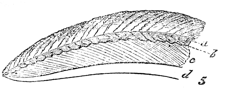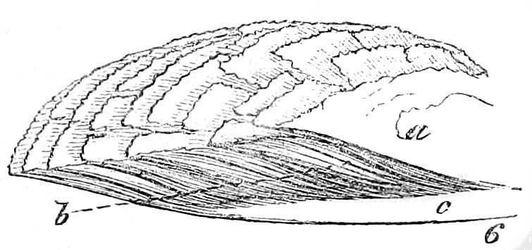 From the apex, the next layer is deposited on its edge, and advancing beyond it necessarily adds to its extent. Thus, suppose for the sake of illustration, the part marked a in the diagram, fig. 4, to represent a nucleus, the cross lines (l) will shew the consecutive layers, which enlarge their circle as they add to their numbers. This disposition of shelly matter into layers is marked externally by concentric striæ, or lines of growth, while on the inside the edges of the laminæ are consolidated into a kind of enamel. If a perpendicular section of a solid portion of a shell were magnified, it would present, in many instances, an appearance resembling the diagram, fig. 5; a may be taken to represent the horny part of the layers which form the outer coating, named "Periostaca," or "Epidermis;" the undulating line b, is formed by the edges of the calcareous layers, and causes the striæ, or lines of growth, which are often distinguishable on the surface of the shell; the space c is the middle part of those layers, and at d they are consolidated into the enamel which lines the interior.
