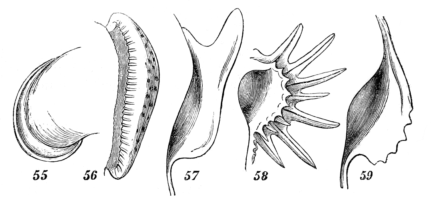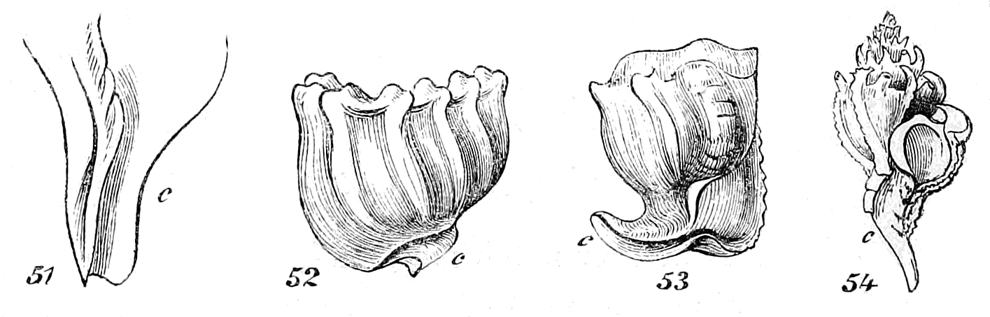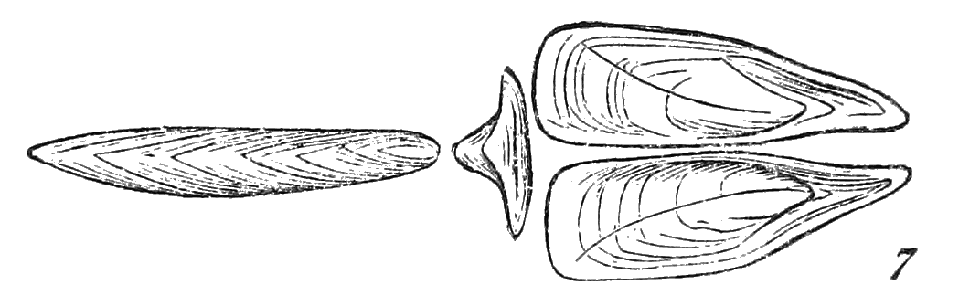The same may be said respecting the bivalves; for besides the principal portions or valves of which the shell is composed, there are in many species, one or two smaller separate portions, named "accessary plates" by some authors. They are fixed by means of cartilages, on the back of the hinge.—The engraving, fig. 7, represents the accessary valves of a species of Pholas, which was on this account arranged by Linnæus with the Multivalves. Nearly allied to the Pholades is a set of shells to which De Blainville has given the name "Tubicolæ," or inhabitants of tubes. In this case, the bivalve shell is connected with a testaceous tube or pipe, to which it is attached either by one or by both valves, or in which it lies attached only by the cartilages of the animal. In the genus Aspergillum, the two small valves are soldered into the sides of the tube in such a manner as to constitute a part of it. One of these shells, called the Water-spout, might be taken up by a person not aware of its real nature, and regarded as a pipe or tube prettily fringed, and nothing more; but upon a closer examination, he would find the two valves, the points of which are visible from the outside of the tube.
