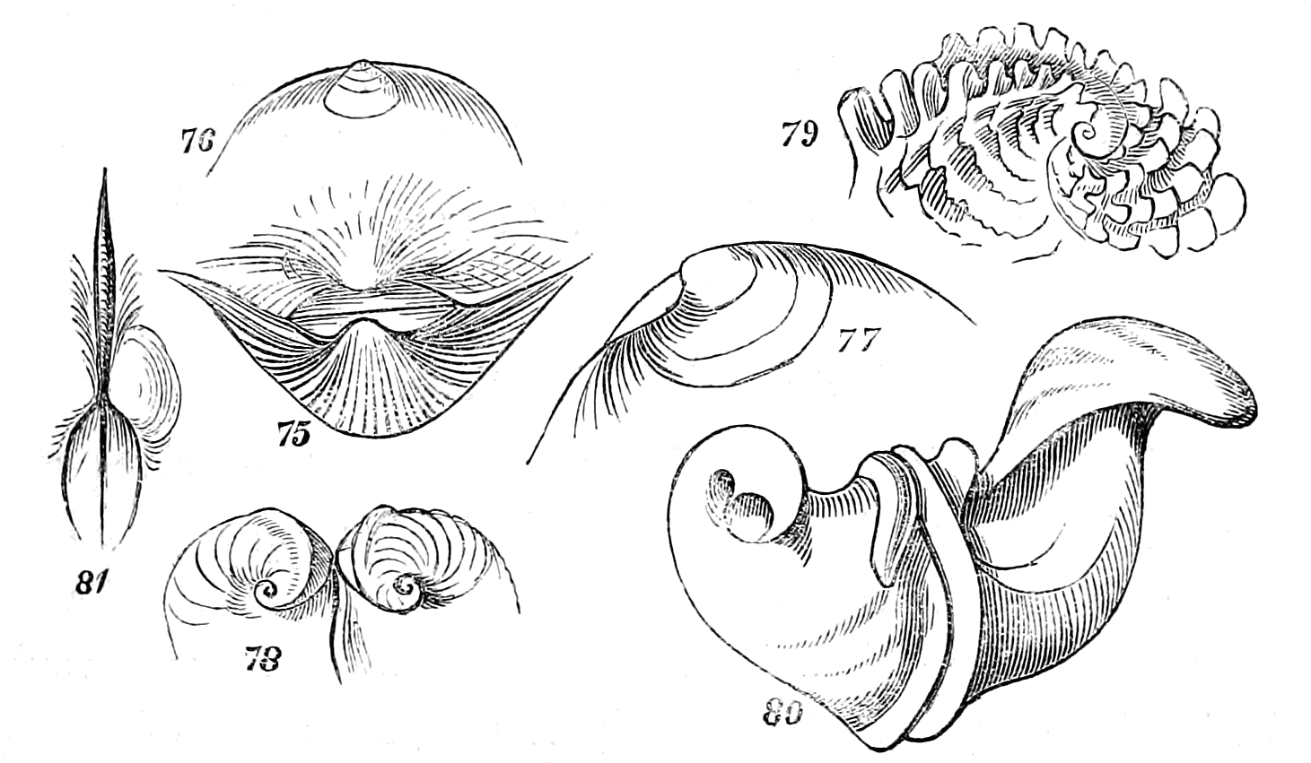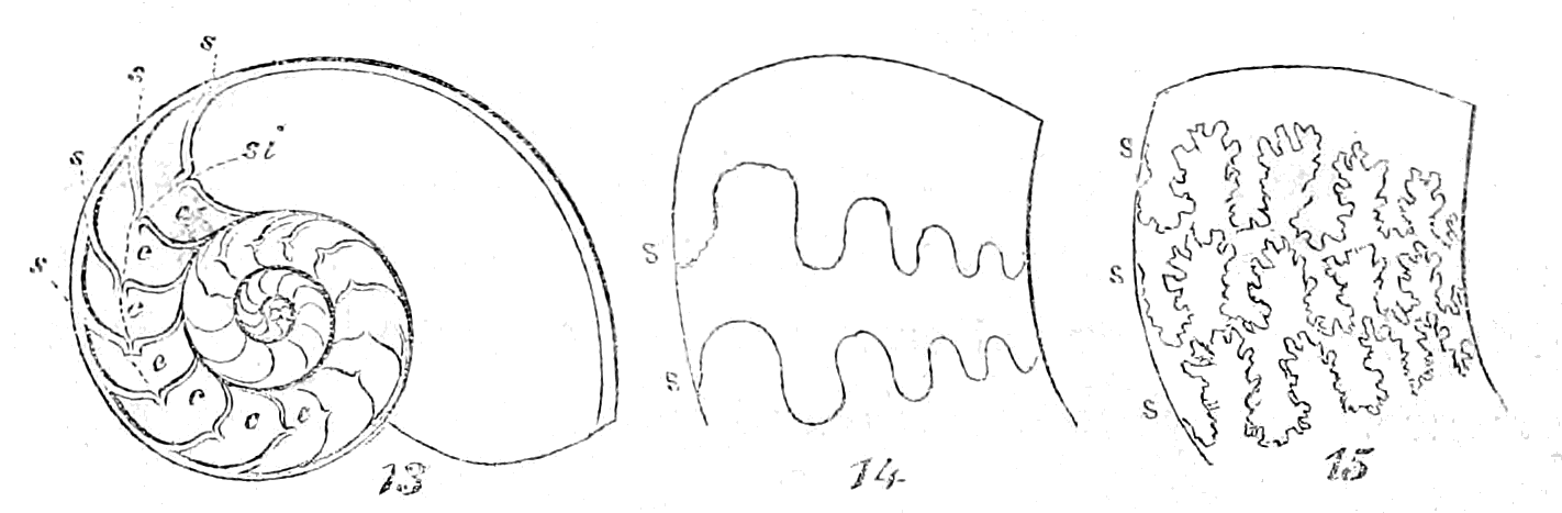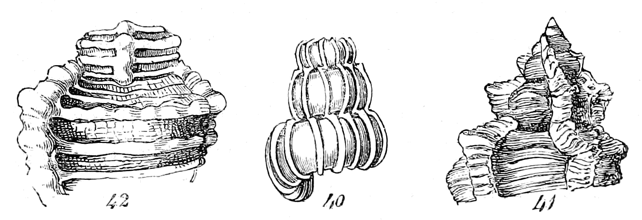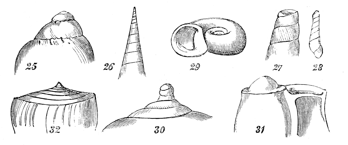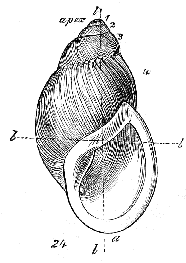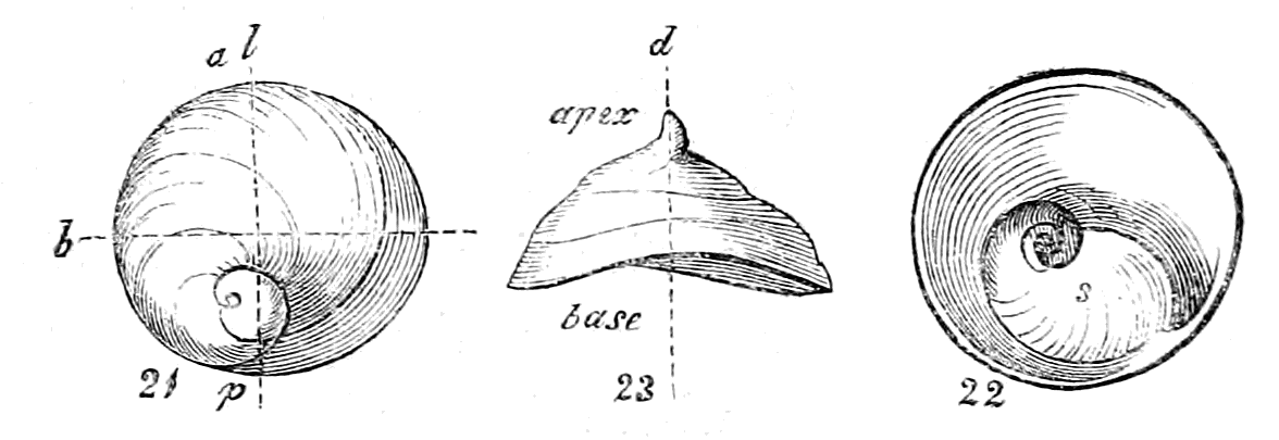 In considering Univalves merely with reference to their mathematical construction, the first point demanding our attention is, whether they are symmetrical or non-symmetrical, or, in other words, whether a straight line drawn through the shell would divide it into two equal parts. The greater part of univalves are non-symmetrical, being rolled obliquely on the axis; but many are symmetrical, being rolled horizontally on the axis. The Nautilus presents an illustration of the latter; the Snail is a familiar example of the former.