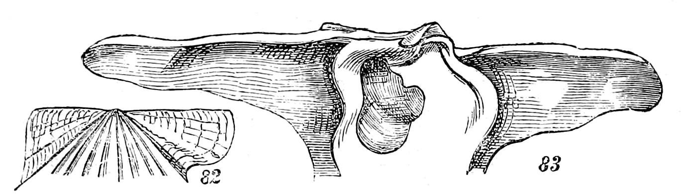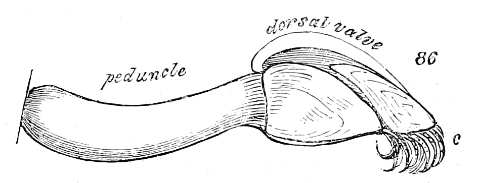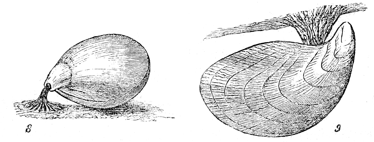 In the former, represented by the cut, fig. 8, the tendon passes through a perforation in the upper valve; and in the latter, Mytilus, fig. 9, the byssus passes out between the valves.