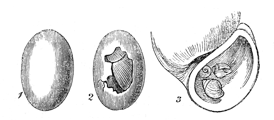 Before the young animal has left the egg, if it be an oviparous species, or the body of the parent if viviparous, the nucleus of the shell is generally formed, and specimens are sometimes preserved in which the young shell is seen within the egg, as in the cut, fig. 1, 2; or adhering to the inner surface of the full-grown shell by the dried mucus of the animal, as seen in fig. 3.