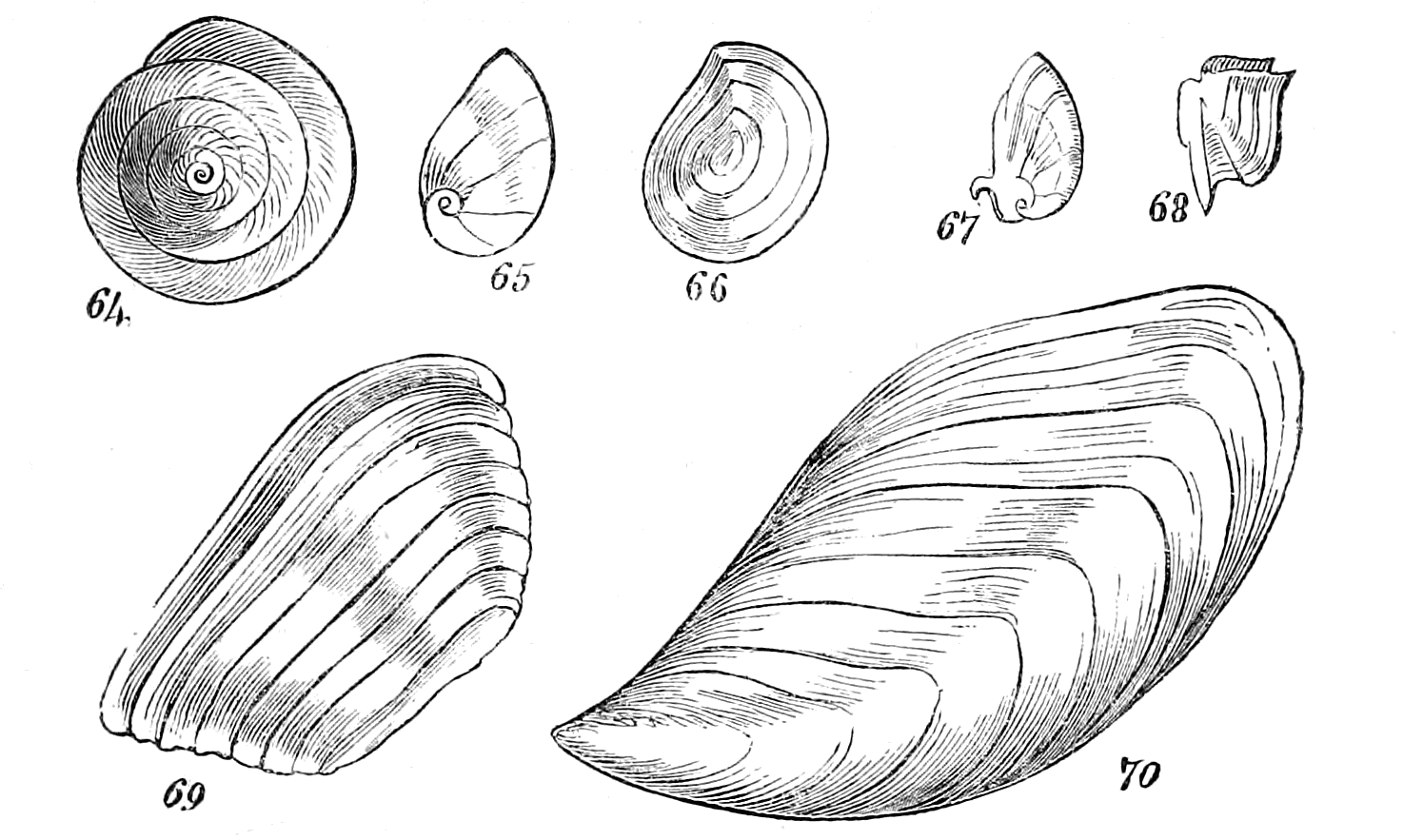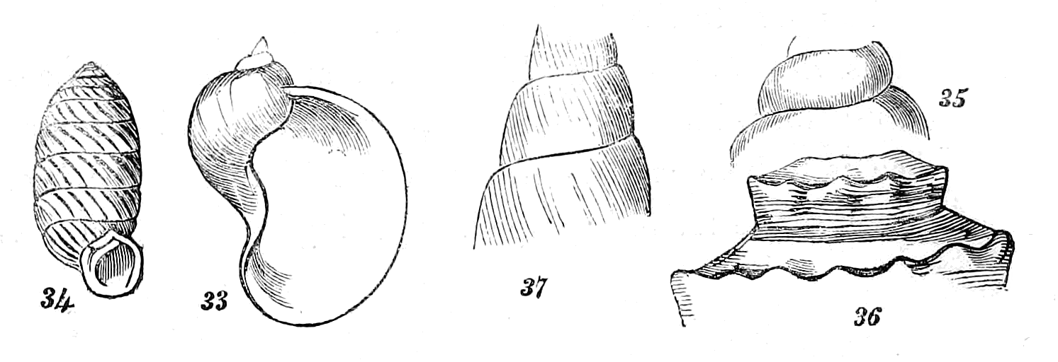 The Aquatic, or Fresh-water Molluscs, such as the Planorbis, commonly called the Fresh-water Snail; the Unio—known by the name of Fresh-water Muscle, is found in ponds, ditches and rivers. The epidermis of these is generally of a thick, close-grained character, and they are subject to corrosion near the umbones. There are but few genera of fresh-water shells besides the Uniones, among bivalves, and the "Melaniana" among univalves. Concerning the former it may be observed, that they are all pearly within, and the colour of the thick horny coating embraces all the varieties of brownish and yellowish green.