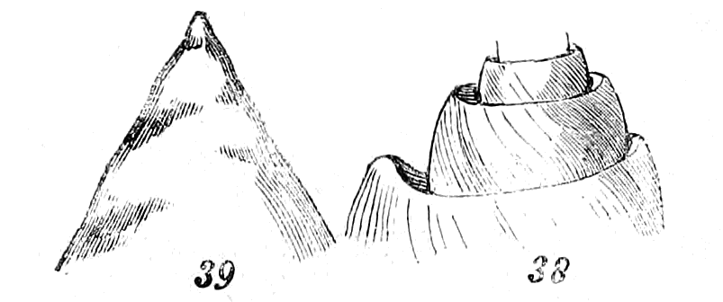 In both cases, the nucleus is generally of a more horny and transparent composition than the parts subsequently produced. As soon as the animal is hatched, or, in other words, leaves the egg or body of the parent, of course it begins to increase in size, and to require a corresponding enlargement in the shell. To effect this, a small quantity of mucus substance, secreted by the mantle of the animal, is deposited on the edge of the aperture. When this is dry and become sufficiently hard, it is lined by a more calcareous secretion; and these together form a new layer, which is followed by others in succession; each new layer being larger than the one that preceded it until the whole being complete, the full-grown animal is invested with a shell commensurate with its own proportions. Thus from the apex or nucleus the formation proceeds, as it were, downwards, taking the shape of the part which secretes it, on which it is in a manner moulded.
