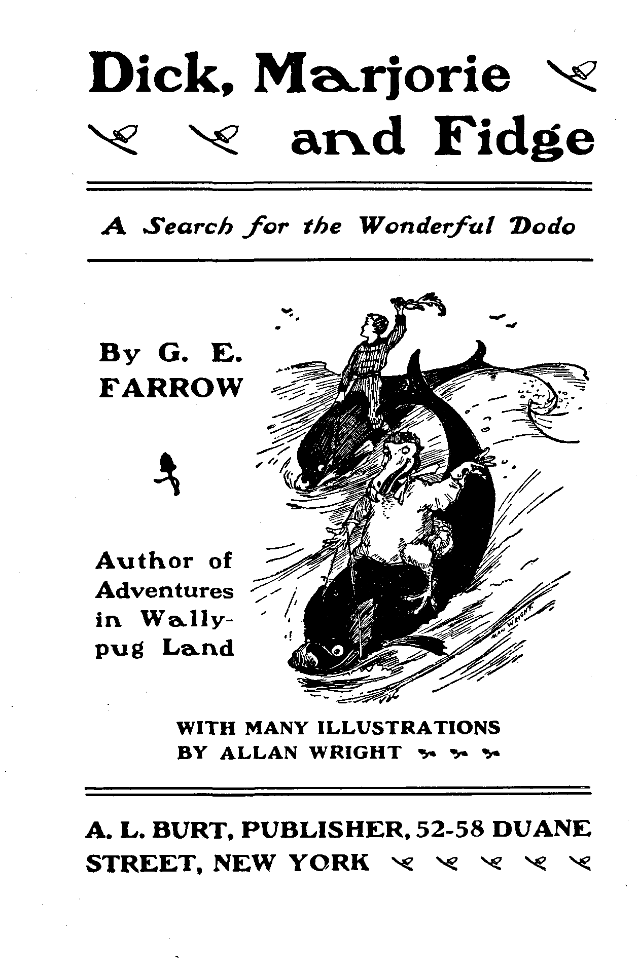 Dick, Marjorie and Fidge A Search for the Wonderful Dodo By G. E. FARROW Author of Adventures in Wallypug Land WITH MANY ILLUSTRATIONS BY ALLAN WRIGHT A. L. BURT, PUBLISHER, 52-58 DUANE STREET, NEW YORK |