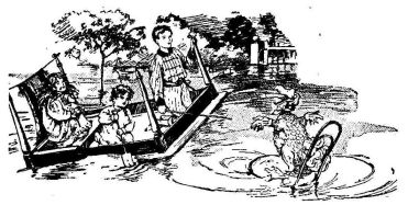 Out in the garden the water became deeper, and Captain Dick’s pole would not reach the bottom; still, owing to some mysterious influence, their curious boat drifted merrily on, and6 the children did not puzzle themselves in the least as to the cause of their progress. It was quite enough for them to notice how strange and unnatural the gardens and all the familiar surroundings appeared in their present inundated state. The rosebushes and hedges looked so funny, growing out of the water, and there were such a lot of curious things floating about—a hen-coop, a wash-tub, and an old hamper had hurried past; and their boat had drifted as far as the gate leading out into the roadway, when Marjorie jumped up and pointed excitedly to something floating rapidly towards them.