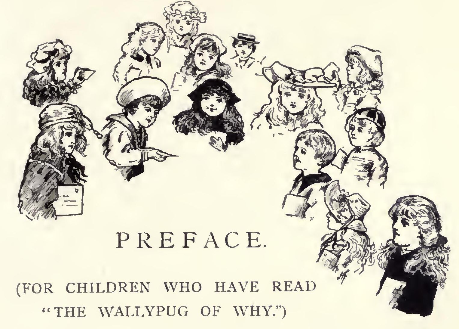 Some of you may perhaps have seen the very kind things which so many of the papers said about “The Wallypug of Why.” Now I am going to tell you a secret, even at the risk of seeming ungrateful to them. It is this. Much as I value their kind opinion, and proud and happy as I am that my book has met with their approval, I value your criticism even more highly than theirs, and I am going to ask you to do me a great favour. I have had so many letters from little friends about “The Wallypug of Why” that it has made me greedy, and, like Oliver, I want more. So will you please write me a letter too, your very own self, telling me just what you think of these two books, and also what kind of story you want after my next one, which is to be a School story, called “Schooldays at St. Vedast’s,” and which will be published almost as soon as this one is? I did think of writing a story about pet animals, for I am very fond of them; so if you can tell me anything interesting about your dogs or cats, rabbits, or other favourites, I may perhaps find room for the account in my book. You can always address letters to me in this way, and then they will be sure to reach me wherever I am:—