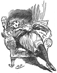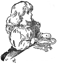 IT was a very warm afternoon, and Girlie was sitting by the play-room window watching the gold fish idly swimming about in her little aquarium. She was feeling very “sigh” as she called it, that is, not very happy, for her brothers were all away from home, and she had no one to talk to. Even Boy, her youngest brother, was staying with some friends at Broadstairs, and she thought it very hard that she should have to wait at home for another week before joining him there. Her aunt, 8with whom she was staying, had received a letter from him that morning and had brought it up to Girlie to read.