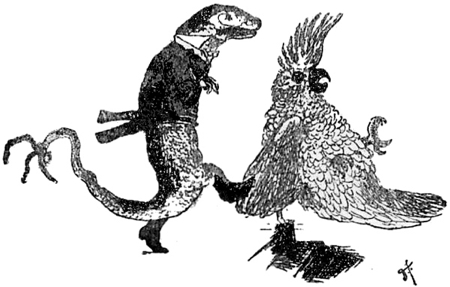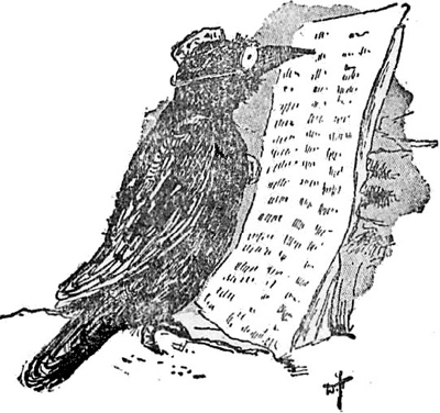 “That’s a very old-fashioned kind of love story; they don’t write them like that at all, nowadays. This is how a modern love story goes”—and he took off his spectacles and held them in one claw while reciting the following verses:—