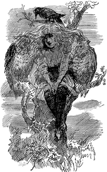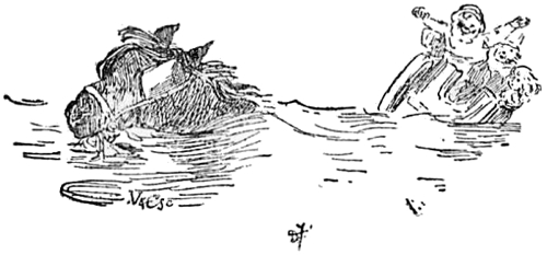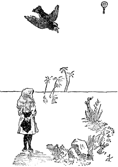 173The sea had become quite calm once more, and Girlie almost wished that she was going back with them in the cart, which they watched floating away on the water, the Bathing-machine Woman waving her handkerchief till they were out of sight. The Royal Microscopist, the Wallypug and Girlie then hurried back to the balloon and, climbing up into the car, they succeeded in getting the anchor loose, and were soon rising rapidly up into the air, the Crow perching in the ropes over their heads.