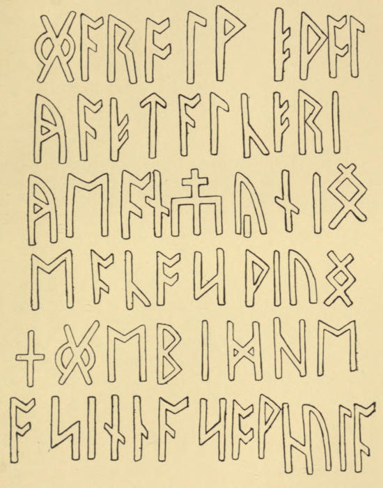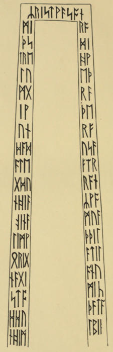 Now in the thirty-two years covered by that short narration, from 657 to 689, events of the utmost moment had occurred in Northumbria, and had mainly centered round Ripon. At the most critical juncture of these events Bede becomes suddenly silent. Alfred’s Anglo-Saxon version of Bede goes further, and omits the bulk of what Bede does say. A few words from Alcuin would have been of priceless value, and he, writing in France to a Frank, could have no national or ecclesiastical reason for silence on points which Bede and Alfred let alone. The whole of the variance[9] between Oswy and his son and sub-King Alchfrith, on which Bede is determinedly silent, the only hint of which is preserved to us solely by the noble runes on the Bewcastle Cross, erected in 670 and still standing, which bid men pray for the “high sin” of Alchfrith’s soul[8]; the whole secret of the variance between Oswy and Wilfrith; of Oswy’s refusal to recognize Wilfrith’s consecration at Paris—with unrivalled magnificence of pomp—to the episcopal See of York; all this, and more, is included in the first thirteen years of Willibrord’s life at Ripon, and Ripon was the pivot of it all. Alcuin has no scintilla of a hint of anything unusual, not even when he mentions Ecgbert, the Northumbrian teacher, dwelling in Ireland, of whom we know from another source that he fled from Northumbria to safety in Ireland when Alchfrith and Wilfrith lost their power, and Alchfrith presumably lost his life. It is quite possible that if the head of the Bewcastle Cross were ever found[9] the runes on it might tell us just what we want to know. The illustration of this portion of the Cross given in Gough’s edition of Camden’s Britannia[10] was drawn in 1607, at which time English scholars could not read runic letters, and naturally could not copy them with perfect accuracy. Still, it is evident that the runes stand for rikaes dryhtnaes, apparently meaning ‘of the kingdom’s lord’, the copyist having failed to notice the mark of modification in the rune for u, which turned it into y.
