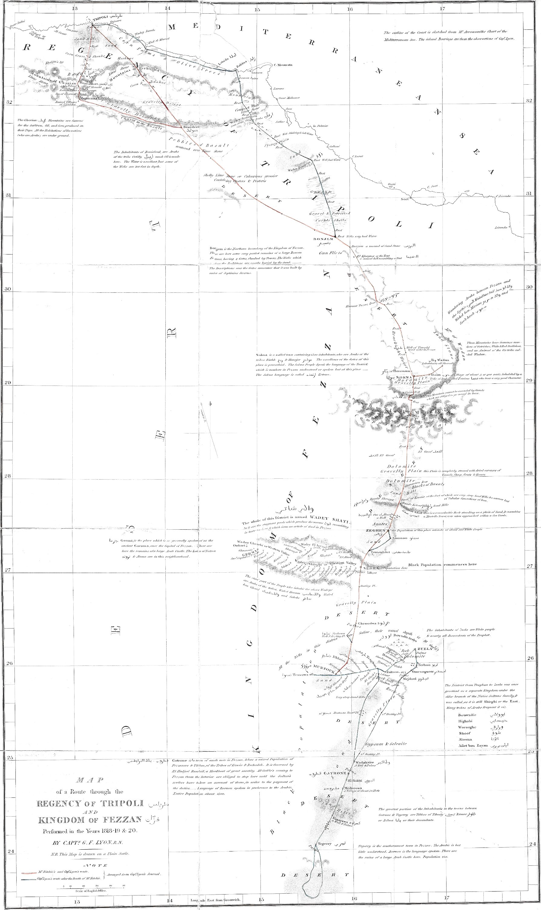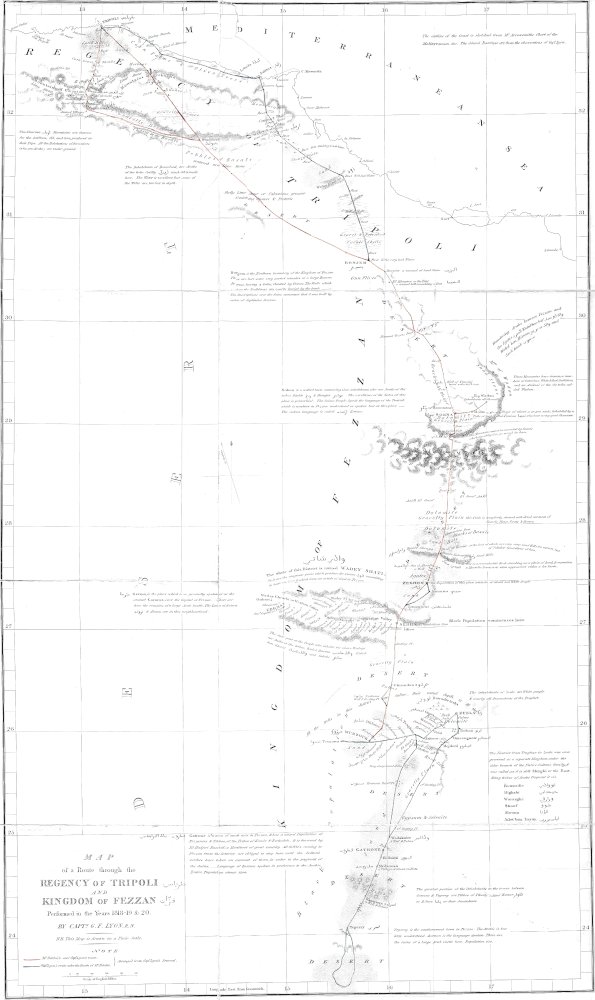 The Tour is divided into two parts. The first comprizes the original progress of the mission from Tripoli to Morzouk, where[vi] the unfortunate Mr. Ritchie died: the second embraces the author’s examination of the remainder of the kingdom of Fezzan, from the death of his companion, until the final return of the mission to Tripoli; it being deemed too hazardous to attempt advancing farther into the interior, without fresh authority and additional pecuniary supplies from Government.