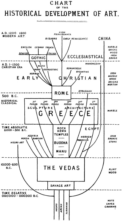 There are no illustrations to this work, but I have annexed a long list of illustrated works on art. My aim in teaching, and writing, has been consistently to induce my hearers and readers to think and study for themselves. Bad or even good wood-cuts are by noxvii means essential in art-books, for we possess in the British, Christy’s, and South Kensington Museums such invaluable art-collections, that we may write books without illustrations if we can induce readers and students to verify what we say by a diligent study of these specimens. Theoretical generalisation ought always to precede our special studies. We only then know when we are able to systematise, to group, to draw analogies, or to arrange our details according to some general principle. If we enter on any study without having prepared our mind to grasp the connecting links in an artistic or scientific subject, our knowledge of an incoherent mass of details will only dwarf our understanding, instead of brightening and clearing it, and we shall become technically-trained machines, instead of self-conscious and self-reasoning creators in any branch of art. The Art Library at the South Kensington Museum is, without any exaggeration, the completest in the world; it abounds in the best illustrated works of all nations. Art-books with bad or indifferent illustrations, or even with good illustrations, are not so much needed as art-books with unbiased theories, esthetical principles, and philosophical ideas, which may awaken the power of reasoning in both readers and students. It is only too often the case that, in seeing bad illustrations, the student imagines he knows everything about the work spoken ofxviii and produced in outlines. He must, however, go and see for himself. Art has its own fairy domain and its own most catholic realm, in which everyone is welcome who can contribute to the improvement, delight, and happiness of man. To induce readers and students to visit, with some fore-thought and fore-knowledge, our vast and unparalleled art-collections, and to convince them, that to detach the study of art from a correct appreciation of the ideas that engendered its forms, is an impossibility, was the task I set myself in writing the pages of this book.