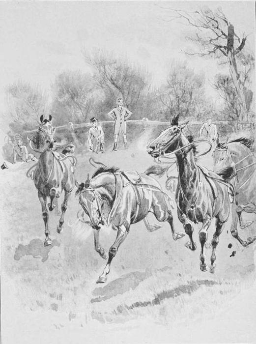 There was a low rail at the extremity of the pasture, fortifying what had once been a gap into the covert itself, a shelter I was most anxious to reach before the eagle-eye of the Earl could spy me out in so untoward a position. I had already made up my mind for a considerable détour which would bring me to a friendly hand-gate (I hate the foolish practice of jumping when hounds are not running), when I saw Tips charge this said rail with the utmost coolness; the four-year-old resenting such an unnecessary demonstration, by turning short round, and kicking out violently at the offending timber.