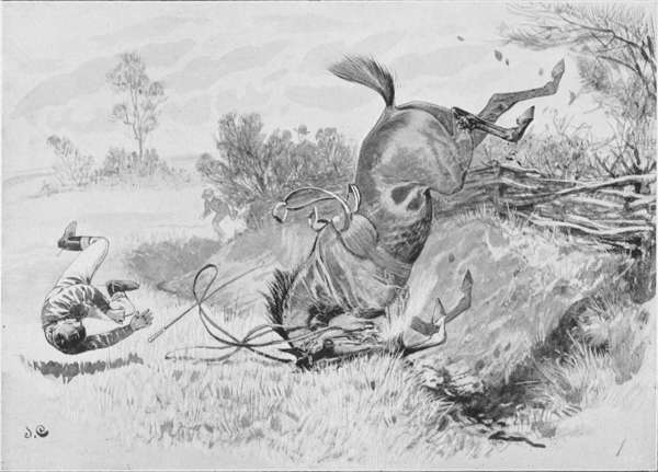 A momentary hesitation, another down-wind turn of the hounds, and there was but one fence between ourselves and the pack. My leader charged it resolutely; I prepared to follow him. It was an ugly place—a downhill gallop at it, a high straggling fence, sedgy banks, and something that was more of a watercourse than a ditch running on the far side. Tips was as eager as a glutton, but the young one’s heart failed him the last stride; and, although his rider had him in such a grasp that he could not refuse, the powder was out of him, and he jumped short, dropping his hind legs, and rolling into the next field. Tips was hardly clear of his horse before he was on him again; and I do not believe he lost half-a-dozen strides by the fall. Why did I not follow? My heart failed me. I thought it would be rash to go where another horse had fallen, though I had seen exactly how it happened; and Tipple Cider was shaking his head, as much as to say, “Why won’t you let me have a drive?” So I went to look for another place.