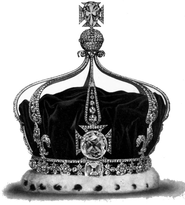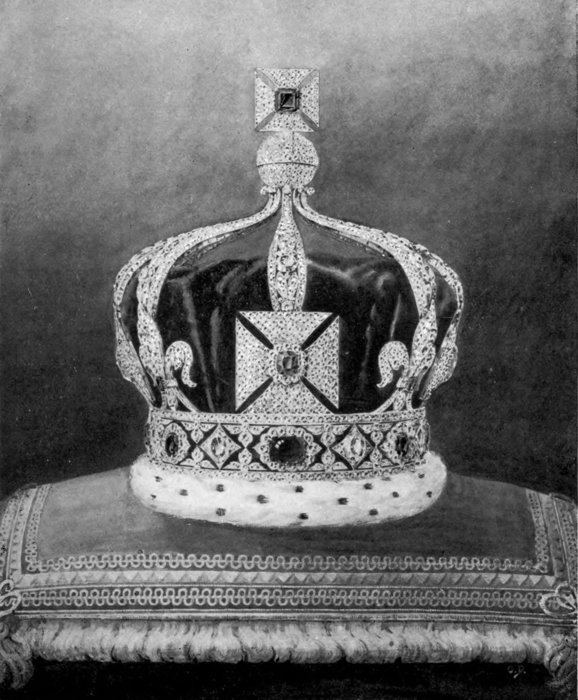 The third Crown of the King is the Imperial Crown of India, made for George V when he was crowned Emperor of India in 1912. As mentioned elsewhere, the Crown of England is not allowed by ancient law to leave the shores of the British Isles; consequently this new Crown had to be made. 39The work was entrusted to the Court Jewellers, Messrs. Garrard, and a very fine example of the jeweller’s art was the result. The Crown cost £60,000, and is adorned with some six thousand precious stones. These are mostly diamonds, but some very large and valuable coloured stones are also displayed. Notably a large cabuchon emerald in front of the band of the Crown, a very fine ruby in the front cross paté, and a very valuable emerald in the cross paté on top of the Crown. In shape the Crown approaches nearer the Imperial shape as pictorially known. Instead of two arches as in the other crowns there are eight demi arches which incline upwards to support the monde instead of being depressed to receive it. These demi arches spring from the eight crosses patés and fleurs-de-lis, which stand on the band of the Crown. The monde, as well as all the crosses patés and fleurs-de-lis, are a mass of diamonds with a large coloured gem in the centre of each. Inside the Crown is the Cap of Maintenance of purple velvet bound at the bottom with minever.