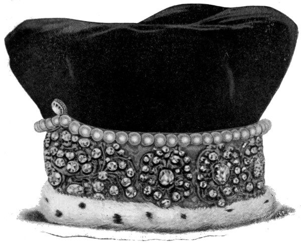 True, the older figure has become somewhat blurred to the younger generation, since Edward VII substituted an Imperial Crown for the older shape on many things, including the Royal mail and Royal note-paper. This was done of set purpose, being a sign and portent that the kingdom had grown into a world-wide empire, greater far and more rich and populous than any empire that had existed since the beginning of the world. But the 36Crown of England retains its ancient shape. Round the band of this Crown are set at intervals great stones of different colours, red, and blue, and green, and yellow. Above the band stand alternately fleurs-de-lis and crosses patés, from these spring the two golden arches of the Crown, edged all the way with large pearls. These arches are the insignia of a ruling monarch; without them the Crown would remain only a coronet. Where the two arches cross each other they are deeply depressed, and in the hollow thus formed stands a monde or globe of gold. On the monde is fixed a richly jewelled cross with large drop-shaped pearls, pendent from the arms. The weight of this Crown is nearly 5 lbs.