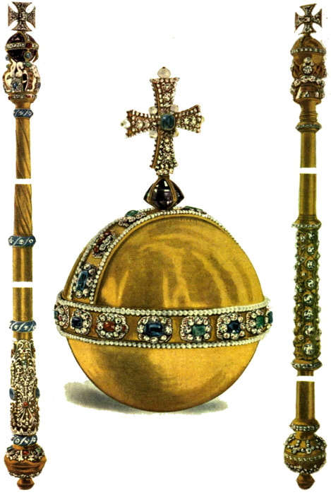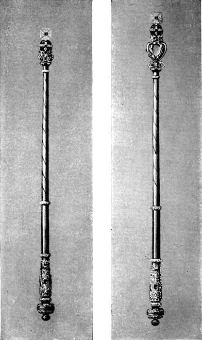 The original crown of Edward the Confessor was destroyed by the Commonwealth, but on the restoration of Charles II a replica was made, and this is the crown now to be seen in the Jewel House, and is the one with which all the Kings and Queens of England have been crowned since 1661. It was made of “massie gold” and is of the shape known as royal in contradistinction to the form described as imperial. The shape of a Royal crown is familiar to all from childhood upwards, for it is the crown which stands on the shield supported by the lion and the unicorn in the arms of England.