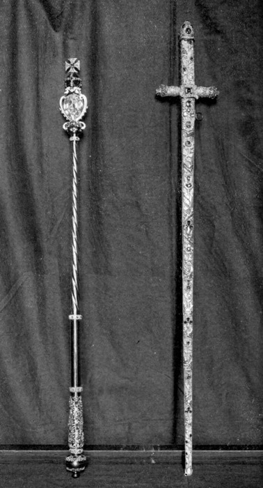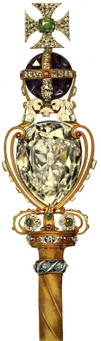 Inside the Crown is the Cap of Maintenance of purple velvet, with an edging of minever to protect the King’s head from too hard a contact with solid gold. The original Crown of England, of which, as has been mentioned, this is a copy, is said to have descended century after century from Edward the Confessor, who ascended the throne in 1042. The Vandals of the Commonwealth have much to answer for!