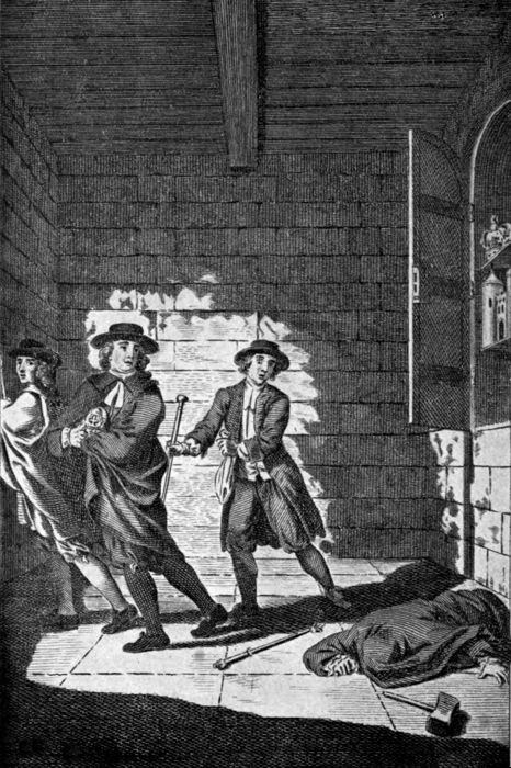 The sole guardian of King Charles’ new Crown Jewels in the Martin Tower, unaided by sentries or yeomen, was an old man named Talbot Edwards, then nearly eighty years of age, who was Assistant Keeper of the Jewel House under Sir Gilbert Talbot. Edwards and his family occupied the upper storeys of the Martin Tower, but Sir Gilbert Talbot lived chiefly at the Palace at Whitehall, it being one of his duties to reside always in whichever palace the King happened to be occupying from time to time. The chamber in which the Jewels were placed was semi-circular in shape with one door, and with very thick walls. In the outer or thickest wall was made, or already existed, a recess which, when a cross-wired door had been added, formed a cupboard, the front of which was open to view. This arrangement was made not only so that the Jewels might easily be inspected, but also because it was one of the perquisites of the Assistant Keeper to show the Crown Jewels to visitors for such fees as he could inveigle out of them. There were no guards either of soldiers or yeomen on the Regalia; 19which fact, becoming known to the notorious Colonel Blood, that worthy with two accomplices attempted to steal the Crown Jewels, as is recorded in due course.[3]